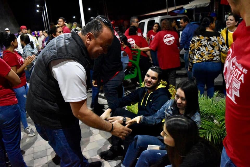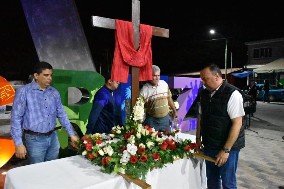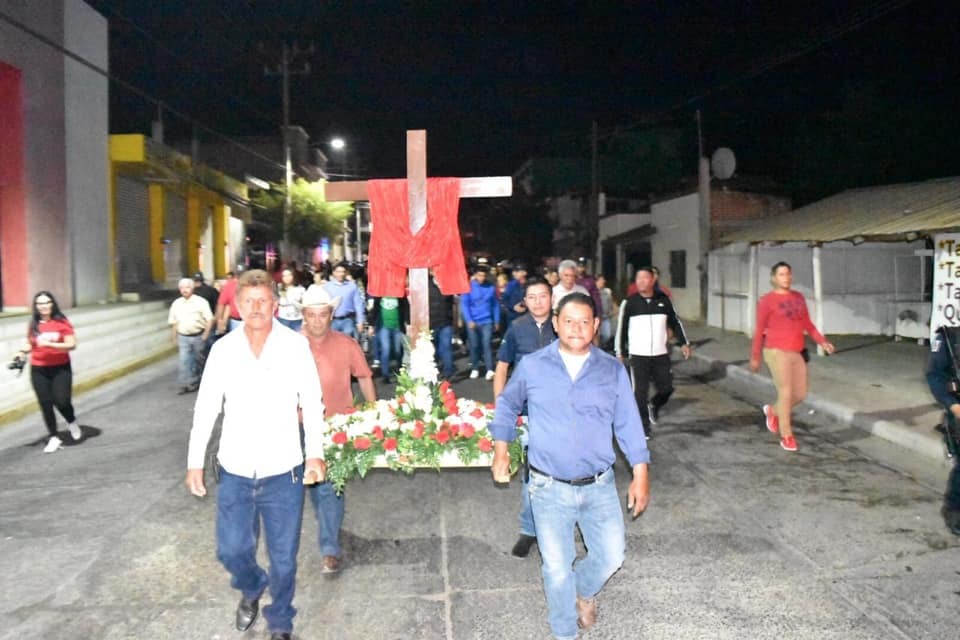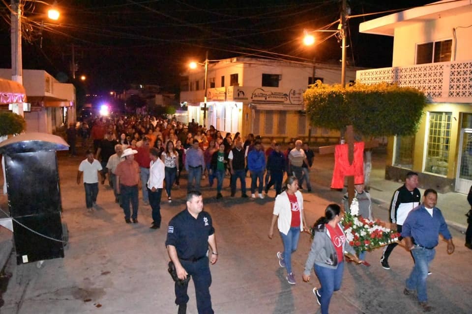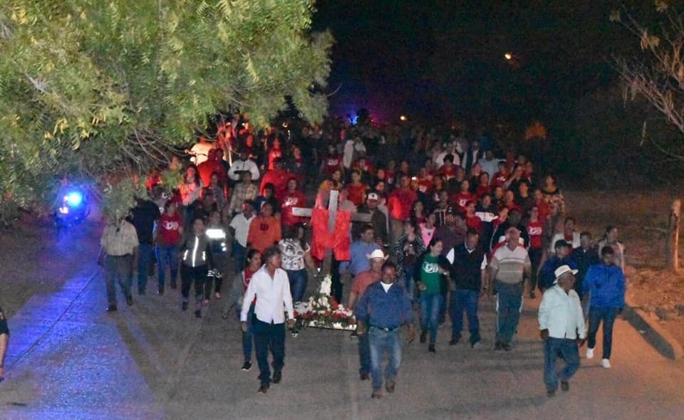 El alcalde Geovani Escobar Manjarrez y su esposa Brenda Gómez de Escobar, presidenta del Sistema DIF Elota, encabezaron la caminata cargando “La cruz de la peregrinación”.