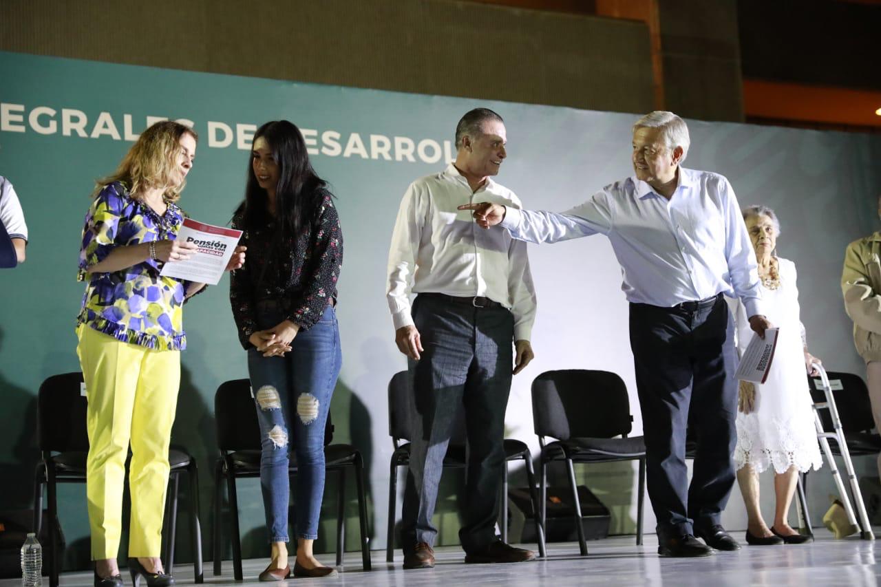 Para culminar una intensa jornada de trabajo que inició por la mañana en El Rosario y una visita al CIP Playa Espíritu, en Teacapán, Escuinapa, la primera de una gira de dos días, el mandatario de la Nación estuvo en la explanada de Palacio de Gobierno, para iniciar la entrega junto con el gobernador, de los apoyos de los Programas Integrales de Desarrollo, que consistieron en becas para personas con discapacidad, apoyos del Programa Jóvenes Construyendo el Futuro, y los apoyos para adultos mayores.