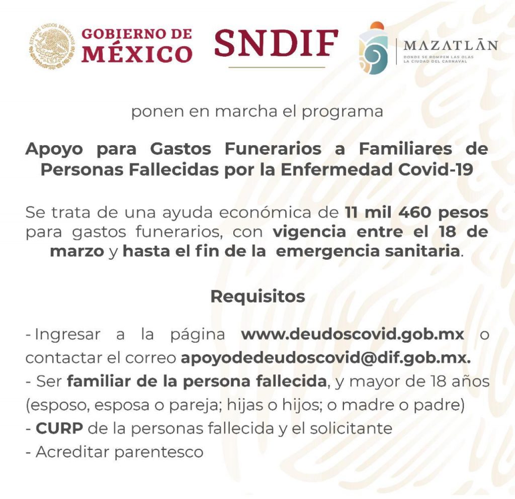 Este apoyo solidario, universal y directo, es por 11 mil 460 pesos para contribuir con los gastos de servicios funerarios, y para obtenerlo el trámite deberá realizarse a través del portal www.deudoscovid.gob.mx o contactar el correo electrónico apoyodedeudoscovid@dif.gob.mx.