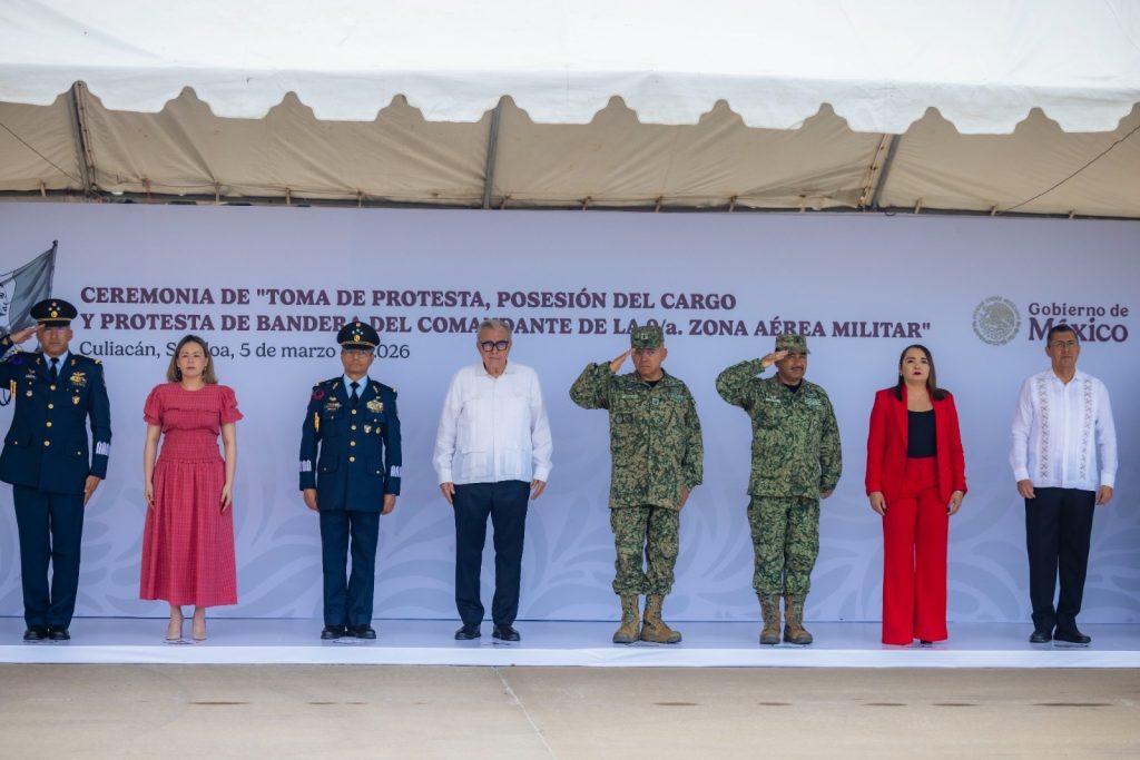 Culiacán, Sinaloa, a 5 de marzo de 2026.- El gobernador Rubén Rocha Moya asistió a la ceremonia donde el general de Ala Piloto Aviador, Edgar Emanuel Campos Martínez, asumió la comandancia de la recién creada Novena Zona Aérea Militar, cuya sede será la Base Aérea Militar No. 10, de la cual ya era el comandante, cambio que obedece a la aplicación la Ley de Protección del Espacio Aéreo Mexicano.