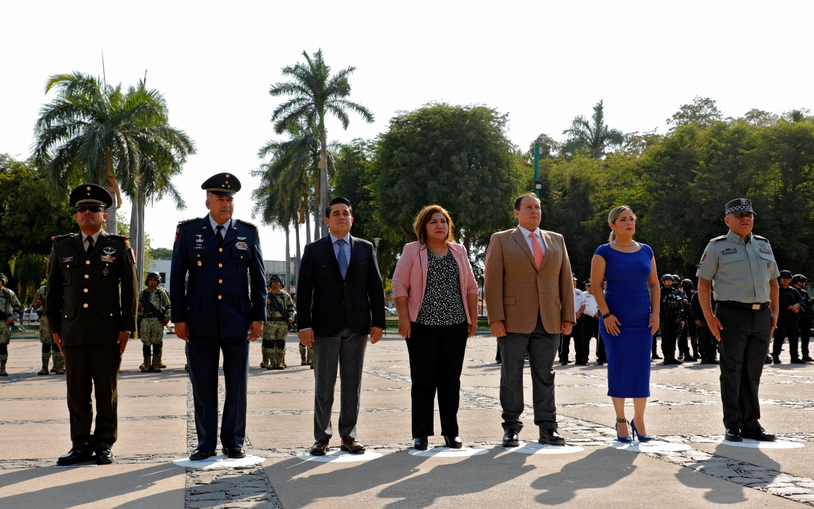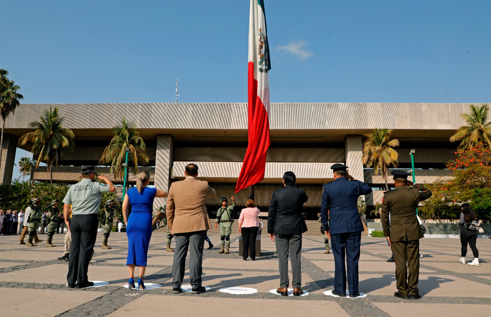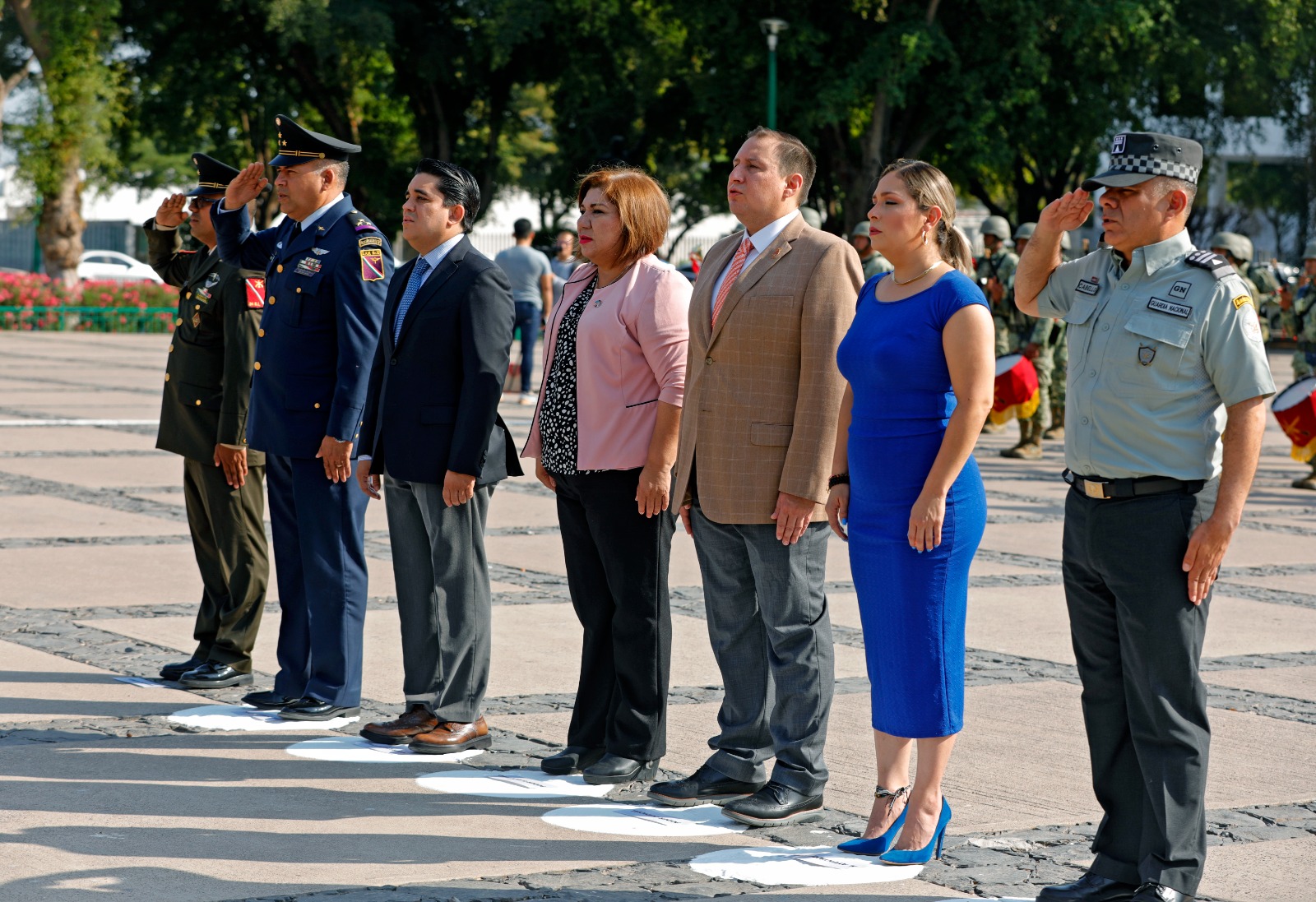 En representación del gobernador Rubén Rocha Moya, la secretaria de Bienestar y Desarrollo Sustentable María Inés Pérez Corral encabezó este acto conmemorativo acompañada por el presidente de la Mesa Directiva del H. Congreso del Estado de Sinaloa Ricardo Madrid Pérez, el presidente del Supremo Tribunal de Justicia Jesús Iván Chávez Rangel, la secretaria de Bienestar Municipal Aline Krystabel Guerra García, el mayor de Infantería y representante de la 9/a Zona Militar Arnulfo Arroyo Canchola, el comandante del 9/o Batallón de la Guardia Nacional Omar Alberto Cabello Zarazúa y el coronel y representante de la base Aérea Militar No. 10 Sergio Núñez Pérez.