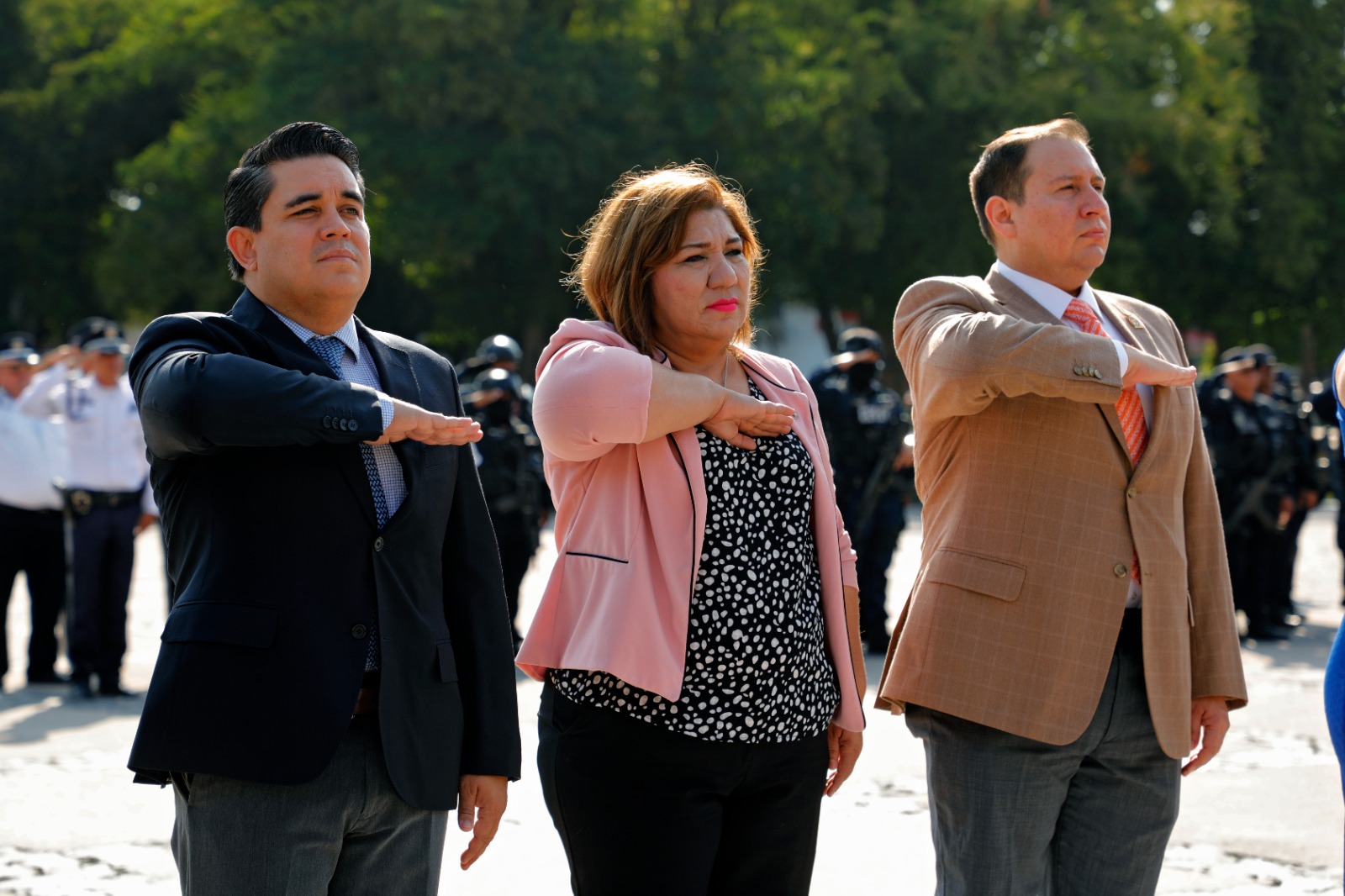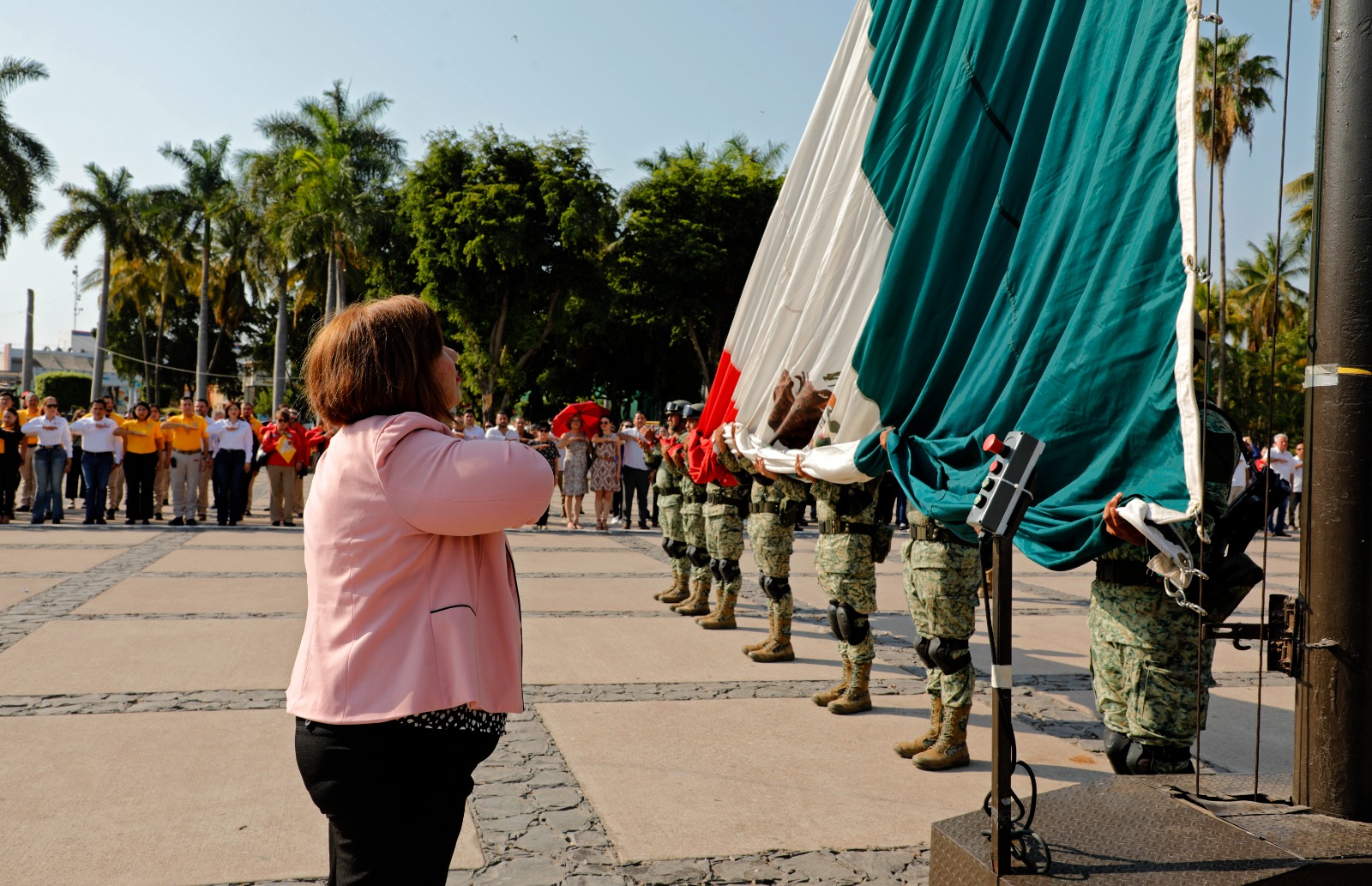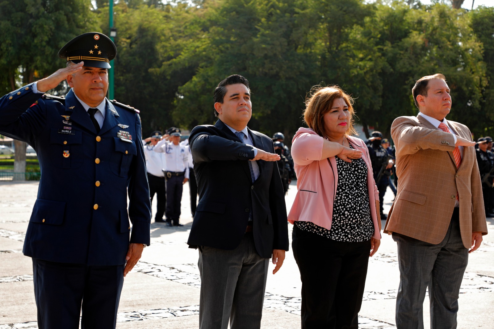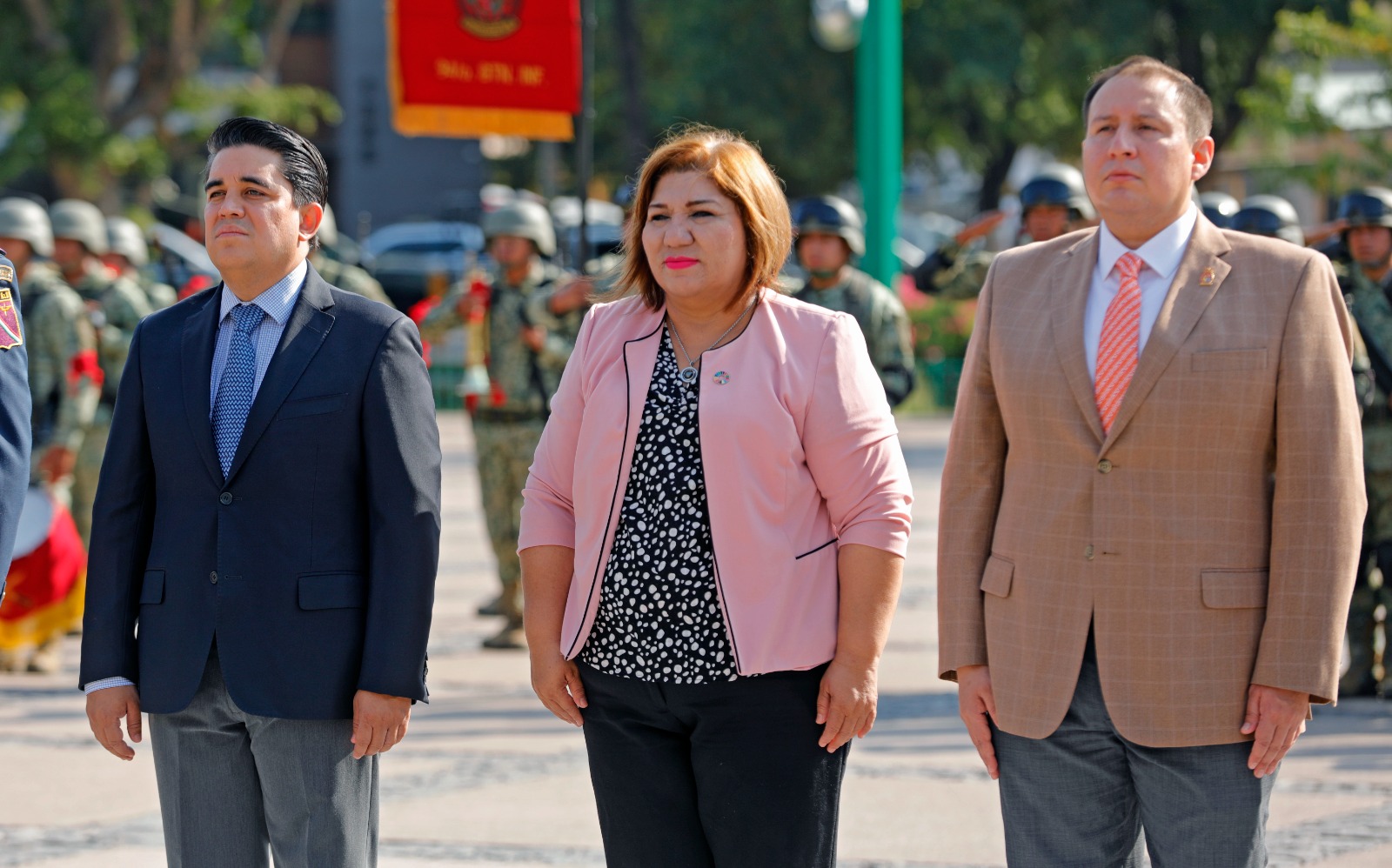 En representación del gobernador Rubén Rocha Moya, la secretaria de Bienestar y Desarrollo Sustentable María Inés Pérez Corral encabezó este acto conmemorativo acompañada por el presidente de la Mesa Directiva del H. Congreso del Estado de Sinaloa Ricardo Madrid Pérez, el presidente del Supremo Tribunal de Justicia Jesús Iván Chávez Rangel, la secretaria de Bienestar Municipal Aline Krystabel Guerra García, el mayor de Infantería y representante de la 9/a Zona Militar Arnulfo Arroyo Canchola, el comandante del 9/o Batallón de la Guardia Nacional Omar Alberto Cabello Zarazúa y el coronel y representante de la base Aérea Militar No. 10 Sergio Núñez Pérez.
