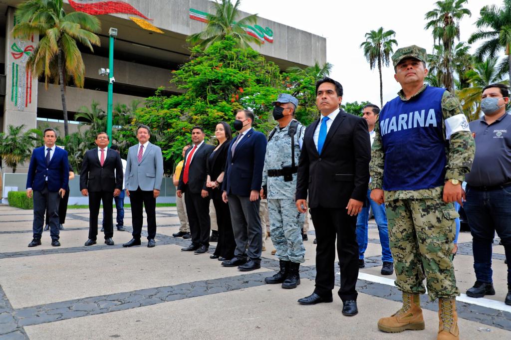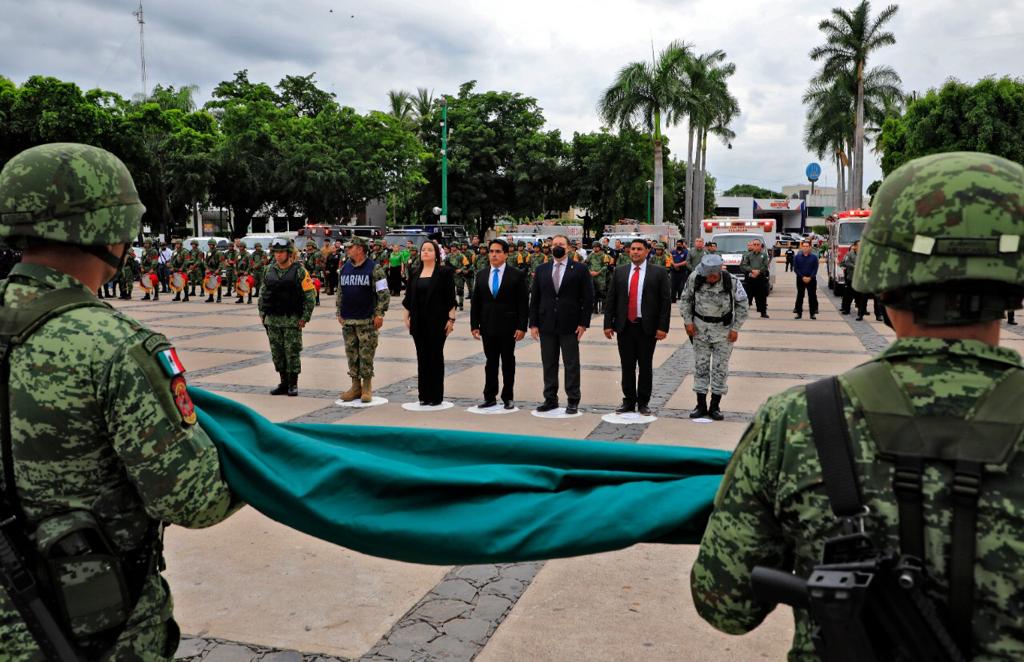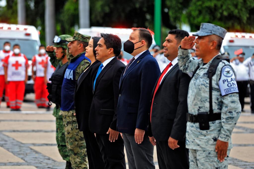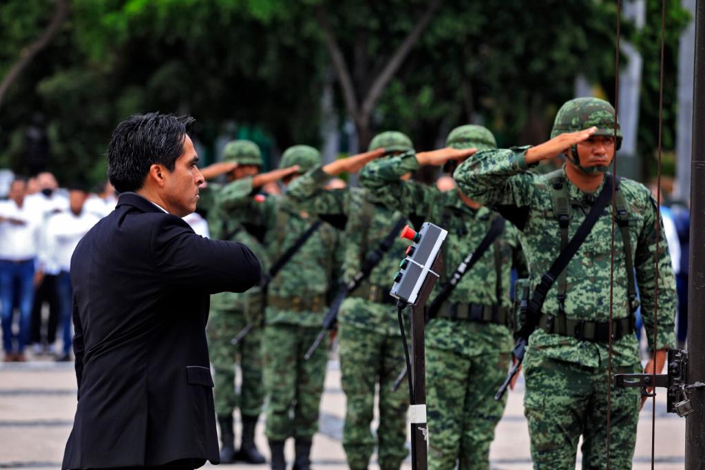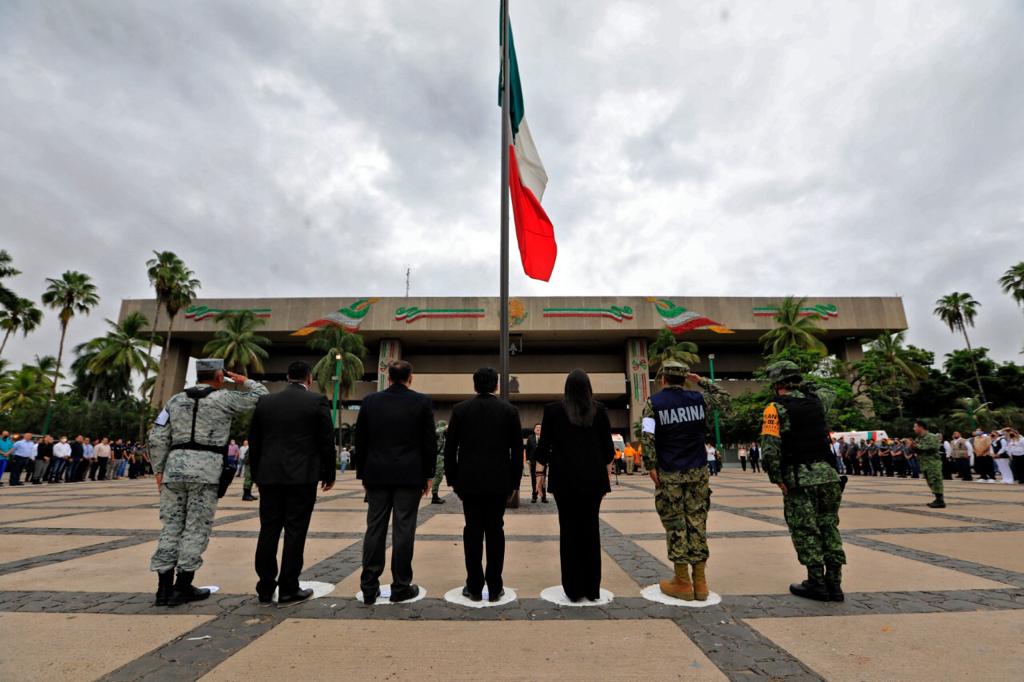 Culiacán, Sinaloa, 19 de septiembre del 2022.- Autoridades civiles y militares conmemoraron el Día Nacional de Protección Civil con un izamiento de bandera a media asta y con Honores de Ordenanza en la plaza cívica de Palacio de Gobierno.
