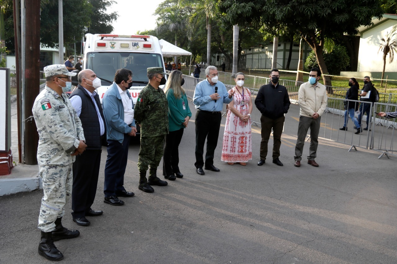 En el lugar, Rocha estuvo acompañado del secretario de Salud Héctor Melesio Cuén Ojeda, el secretario general de la UAS Gerardo Alapizco Castro, la delegada del Seguro Social Tania Clarisa Medina López, el subsecretario de Vinculación Social de la Secretaría de Educación Pública y Cultura (SEPyC), Jorge Quintero Salazar, el delegado de Programas Federales Juan de Dios Gámez Mendívil y el II Subinspector Pedro Álvarez Aguas, jefe de la Sección de Operaciones de la Coordinación Estatal de Sinaloa de la IX Zona Militar.