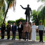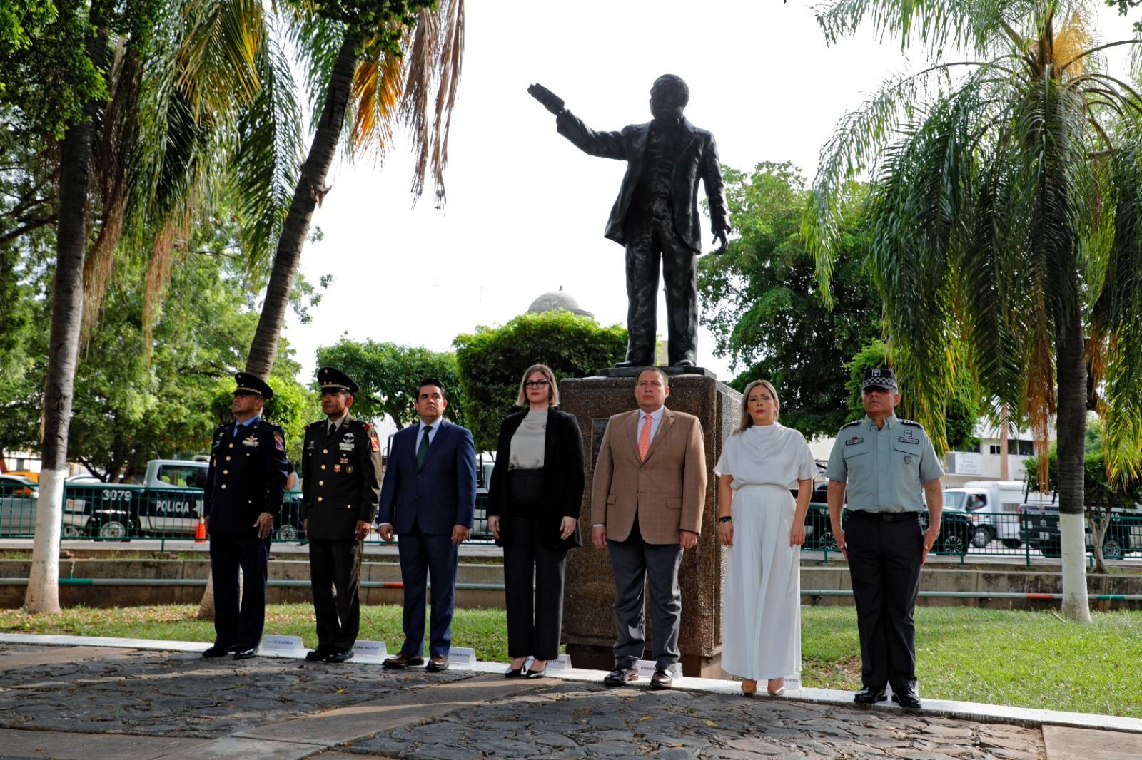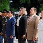 Autoridades de los tres niveles de gobierno, así como mandos de las fuerzas armadas estuvieron presentes en el izamiento a media asta y la guardia de honor en el monumento al Benemérito de las Américas.