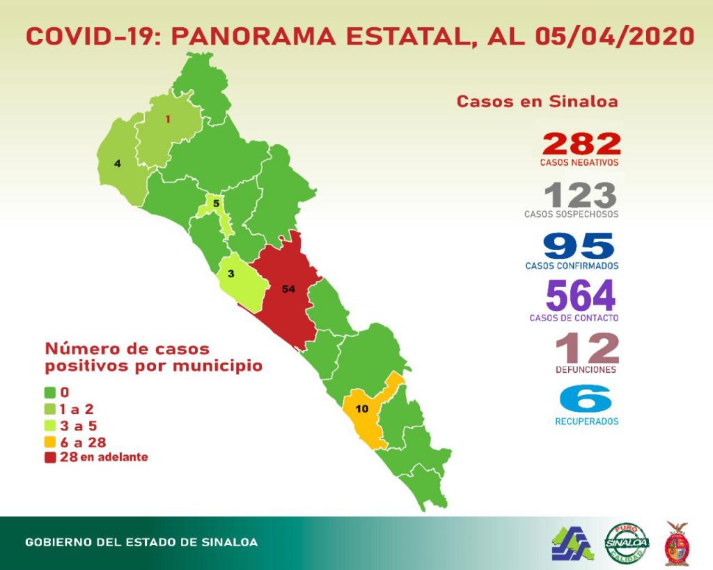 Culiacán, Sinaloa.- Con la muerte de 2 mujeres, de 55 y 72 años de edad, Sinaloa llegó este domingo a 12 decesos por Covid-19, 78 pacientes activos, 6 recuperados y 123 sospechosos.