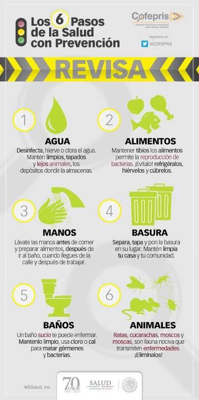 El comisionado destacó que en el marco del fomento y operativos sanitarios se realiza la capacitación de personas en el programa 6 Pasos de la Salud en materia de desinfección y sobre todo en el consumo de agua segura, así como el manejo higiénico de los alimentos, el lavado de manos, la disposición de residuos sólidos, el manejo adecuado de excretas y eliminación de la fauna nociva, todo ello como estrategia para prevenir padecimientos relacionados con la falta de higiene como hepatitis A e infecciones gastrointestinales.