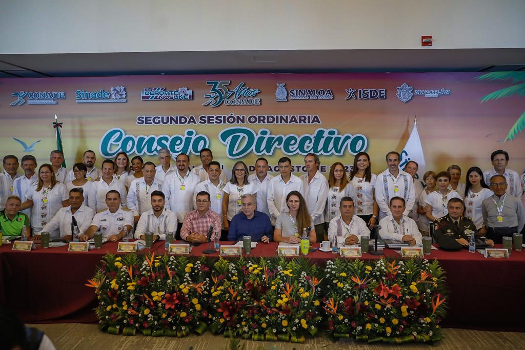 El mandatario estatal inauguró la segunda sesión ordinaria del Consejo Directivo del Sistema Nacional de Cultura Física y Deporte en Mazatlán, acompañado de la directora de CONADE Ana Gabriela Guevara.
