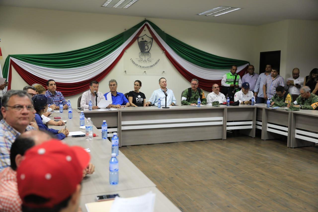 Los Mochis, Sinaloa, a 21 de septiembre de 2018.- En la tercera reunión que encabezó el gobernador Quirino Ordaz Coppel para evaluar los daños que dejó la depresión tropical 19-E, se dio a conocer el objetivo de restablecer en un plazo no mayor a 72 horas el servicio de agua potable y electricidad para las comunidades afectadas en el municipio de Ahome, como son el Poblado 6 y Chihuahuita, las cuales visitaron durante el día.