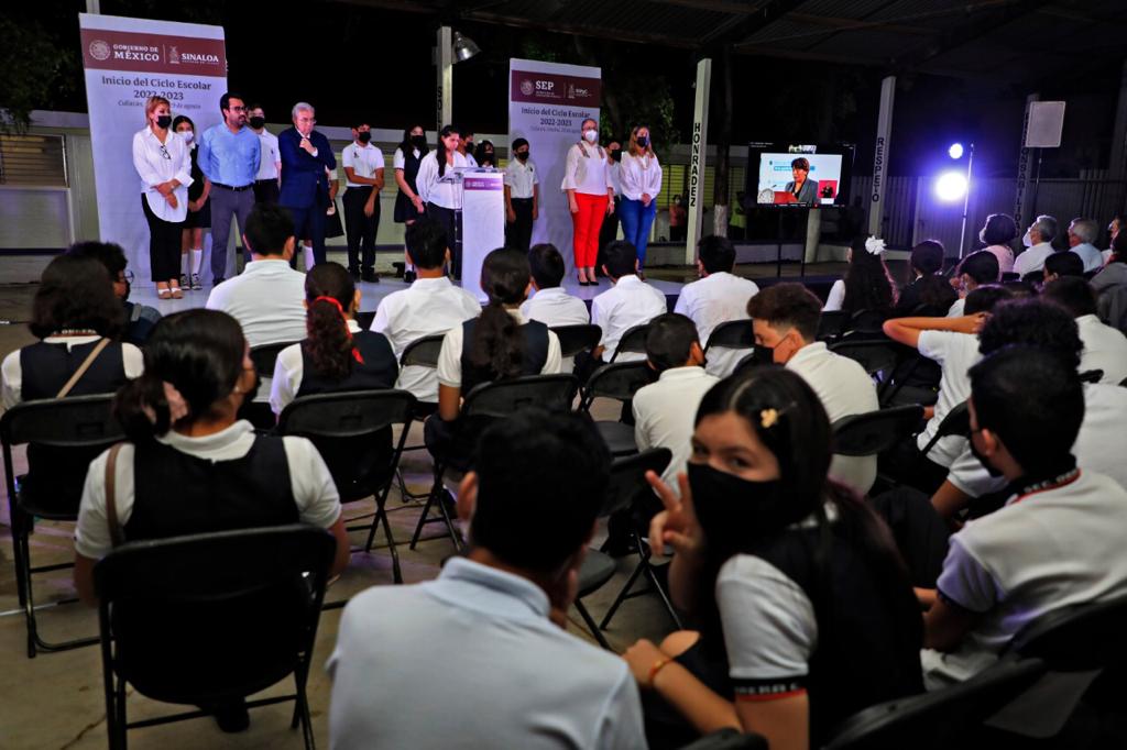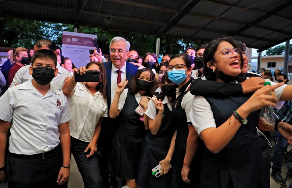 Culiacán, Sinaloa, a 29 de agosto de 2022.- A través de un enlace en vivo en la Conferencia Mañanera del Presidente Andrés Manuel López Obrador, en la que también estaba presente Delfina Gómez, titular de la SEP, el Gobernador Rubén Rocha Moya brindó la bienvenida al ciclo escolar 2022-2023 a los 575 mil niños y jóvenes sinaloenses que inician clases el día de hoy, desde las instalaciones de la Escuela Secundaria “Obrera Campesina”, acompañado por Graciela Domínguez Nava Secretaria de Educación Pública, Juan de Dios Gámez, Alcalde de Culiacán, Norma Leyva, Directora del plantel, además de alumnos y maestros.