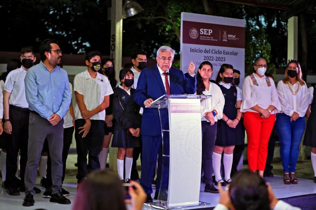 El Ejecutivo Estatal concluyó felicitando a los 56 mil maestros que existen en Sinaloa, enfatizando la capacitación que les brindarán sobre el nuevo plan de estudios, agradeciendo profundamente al Presidente López Obrador y a la Secretaria de Educación, Delfina Gómez su apoyo y respaldo para Sinaloa en este nuevo ciclo escolar.