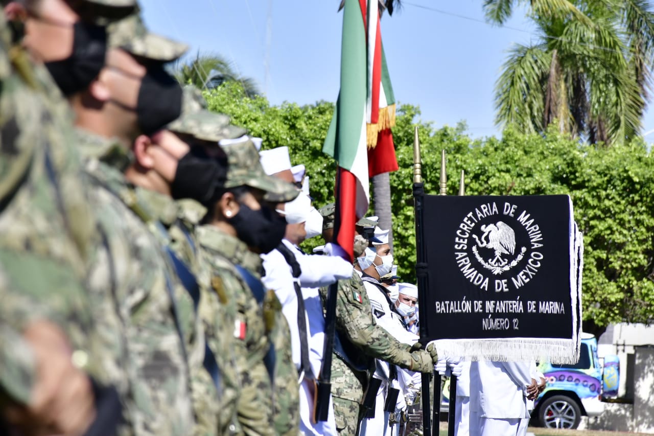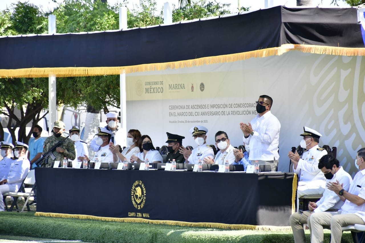Mazatlán.- Autoridades de los tres niveles de Gobierno participaron en la conmemoración del 111 aniversario de la Revolución Mexicana en las instalaciones de la Cuarta Zona Naval, donde se entregaron condecoraciones a personal que tiene entre 10 y 40 años de servicio activo en la Armada de México, y ascensos al grado superior inmediato.