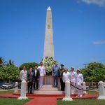 Como parte de la ceremonia, el gobernador Rocha y el almirante Abarca, encabezaron la guardia de honor y colocación de ofrenda floral en el Monumento al Marino Caído, junto con las demás autoridades invitadas, mientras la Banda de Guerra de la Escuela Náutica Mercante de Mazatlán, entonó marcialmente el Toque de Silencio.