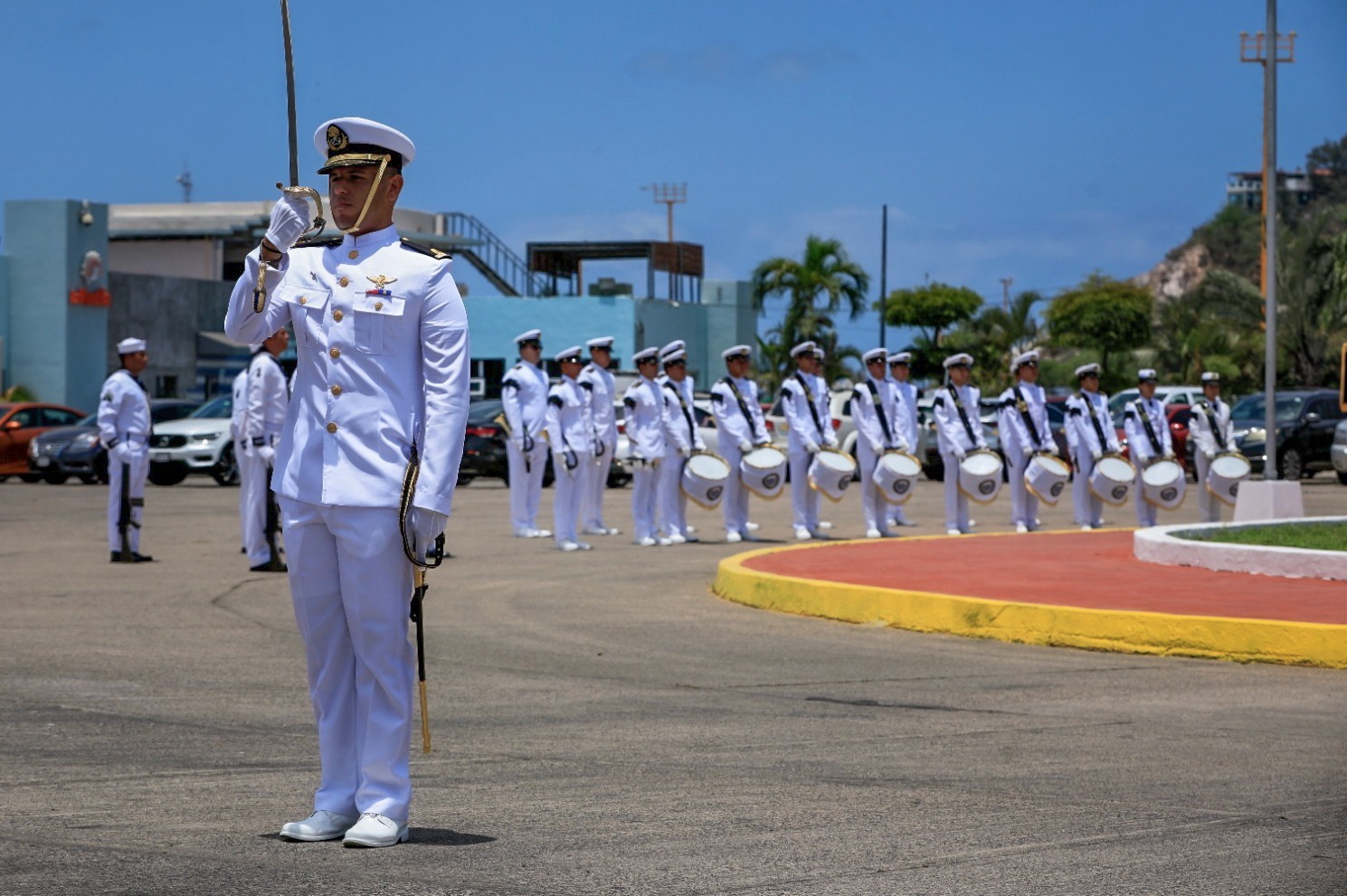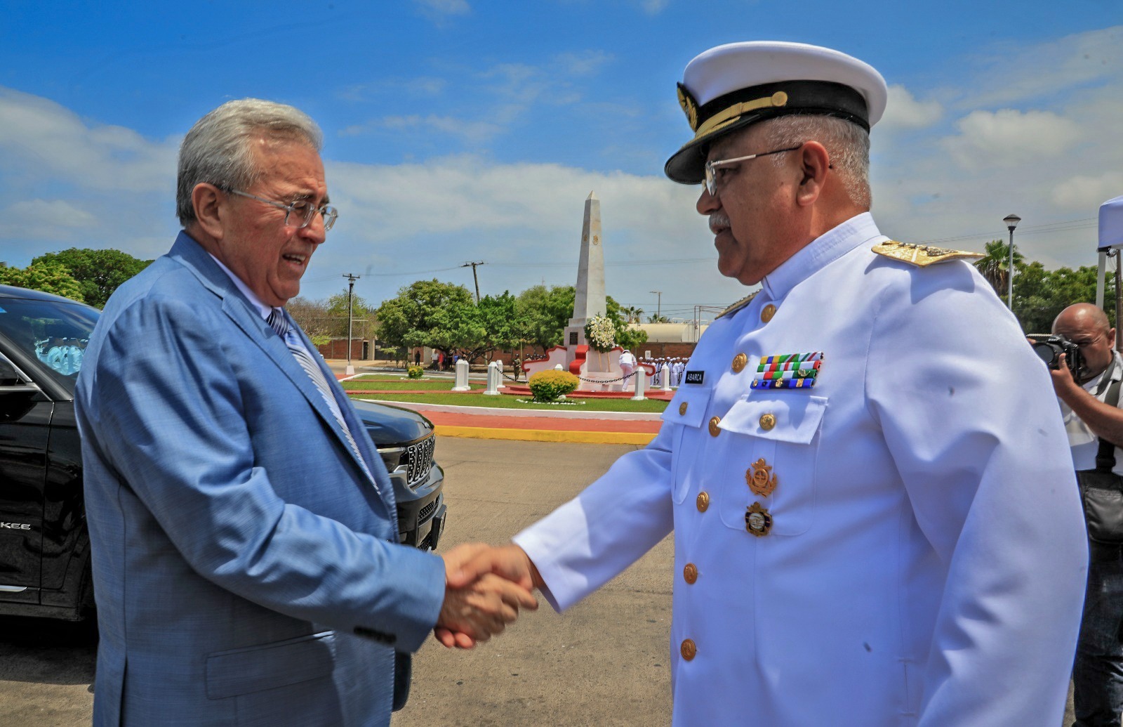 Como parte de la ceremonia, el gobernador Rocha y el almirante Abarca, encabezaron la guardia de honor y colocación de ofrenda floral en el Monumento al Marino Caído, junto con las demás autoridades invitadas, mientras la Banda de Guerra de la Escuela Náutica Mercante de Mazatlán, entonó marcialmente el Toque de Silencio.