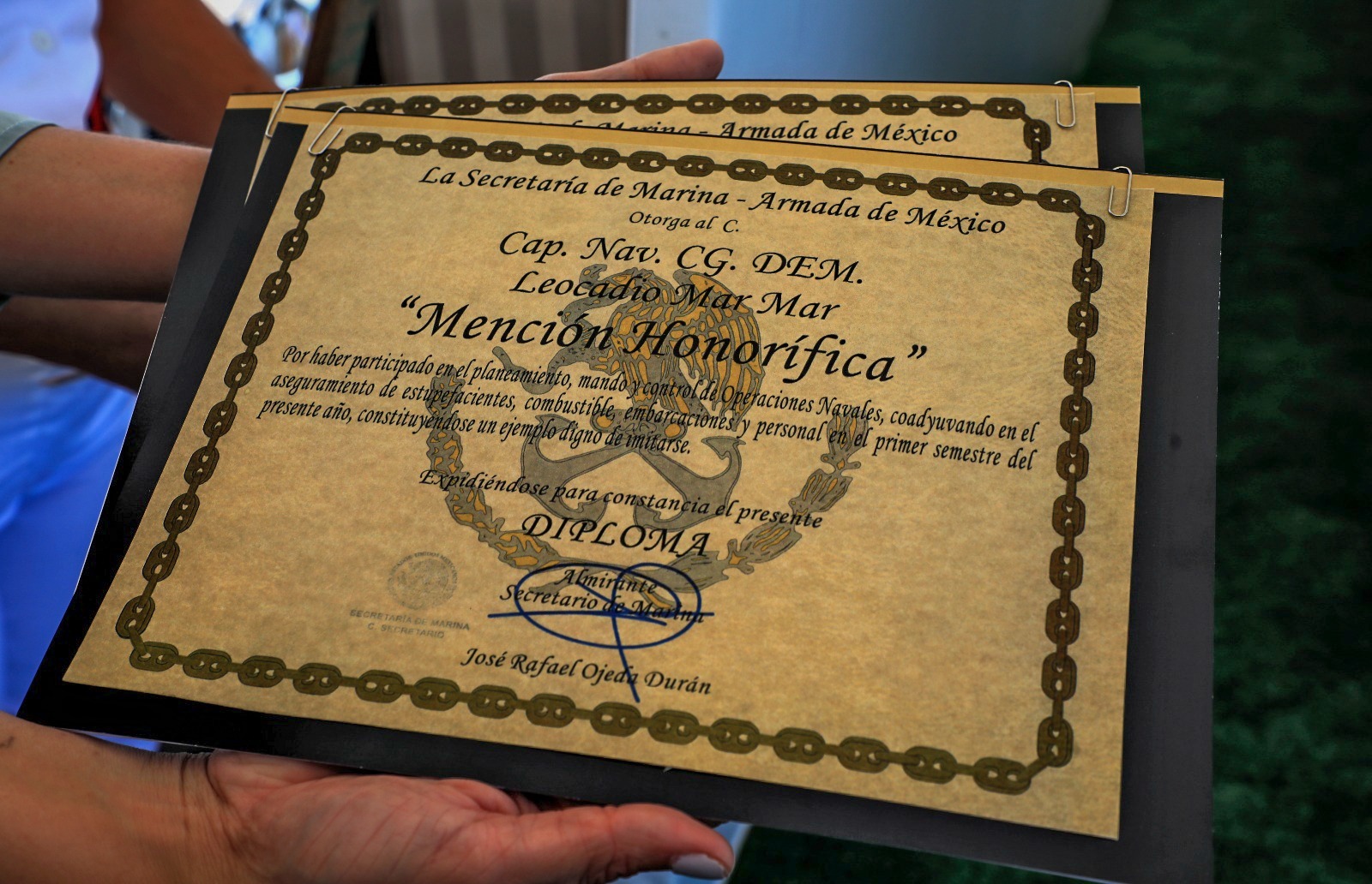 De igual manera, se hicieron entrega de Menciones Honoríficas de la Secretaría de Marina por haber participado en operaciones de navales, coadyuvando en el aseguramiento de estupefacientes, combustibles y embarcaciones en este primer semestre del año, al capitán de Navío, Leocadio Mar Mar; y al también capitán de Navío, Máximo Eduardo Rodríguez Villalobos, quienes recibieron sus diplomados de manos del gobernador Rocha y del almirante Abarca.