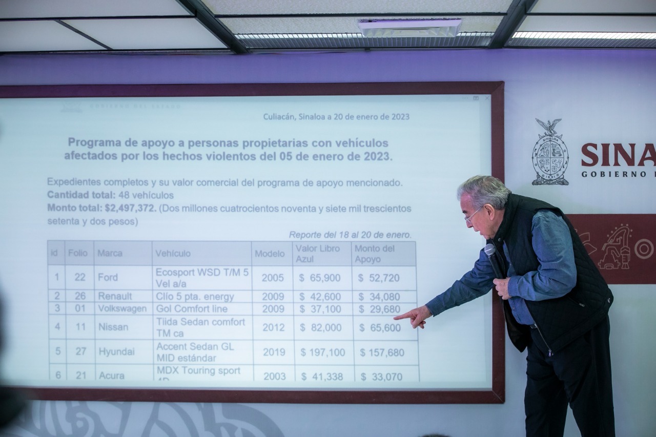 Culiacán, Sinaloa, a 23 de Enero de 2023.- Acorde con la política estatal de atención efectiva a las demandas sociales, este lunes, en el marco de su Conferencia Semanera, el Gobernador Rubén Rocha Moya dio a conocer que hasta el momento se han entregado 48 ayudas económicas dentro del programa de apoyo a personas propietarias de vehículos despojados el pasado 05 de enero de 2023, destacando que en un lapso menor de 15 días, se está otorgando una solución concreta a esta petición ciudadana, por conducto de la Dirección de Gobernabilidad Democrática de la Secretaría General de Gobierno, en coordinación con la Comisión Estatal de Víctimas.