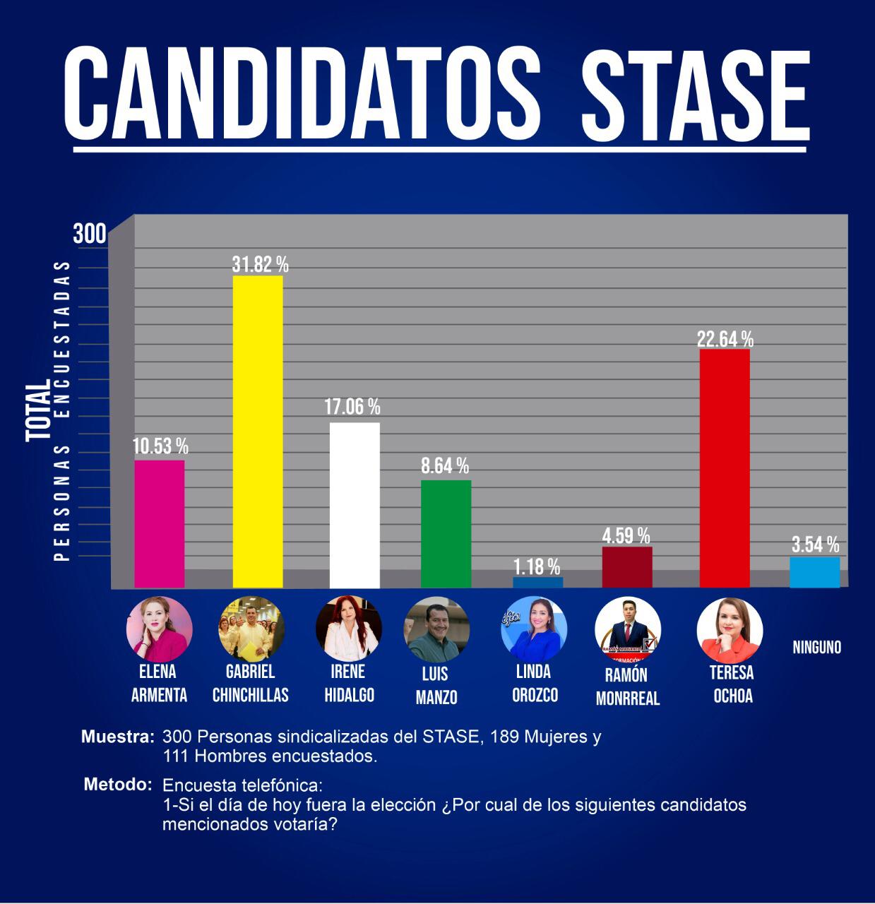 Ante la expectación que han generado las próximas elecciones del STASE, Sindicato que cuenta con más de 8 mil sindicalizados, Punto y Coma Noticias realizó una encuesta con 300 llamadas telefónicas a 189 mujeres y 111 sindicalizados, con una sola pregunta: Si hoy fuesen las elecciones, ¿Por cuál de los siguientes candidatos votaría?
