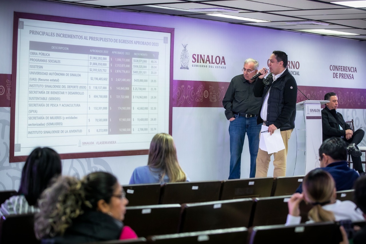 «Aquí son los que más crecimiento tuvieron: Obra Pública tuvo un 49 por ciento; los programas sociales un 28 por ciento de incremento; ISSSTESIN, 20 por ciento; Universidad Autónoma de Sinaloa, 19 por ciento, ahí están los 425 millones de pesos que hablamos la semana pasada que son 300 etiquetados para arreglar el tema del crédito fiscal con el SAT, los 25 extraordinarios y 100 millones de pesos en el irreductible; el Instituto Sinaloense del Deporte, 21 por ciento; la Secretaría de Bienestar y Desarrollo Sustentable, 19 por ciento; Secretaría de Pesca y Agricultura 32 por ciento; Secretaría de Mujeres, 24 por ciento y el Instituto Sinaloense de la Juventud, 32 por ciento», precisó el Secretario de Administración y Finanzas.