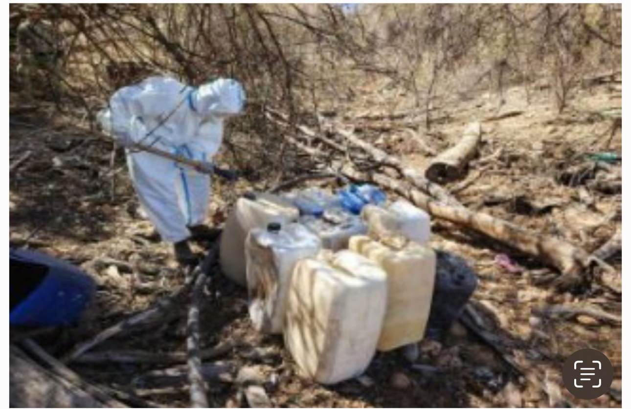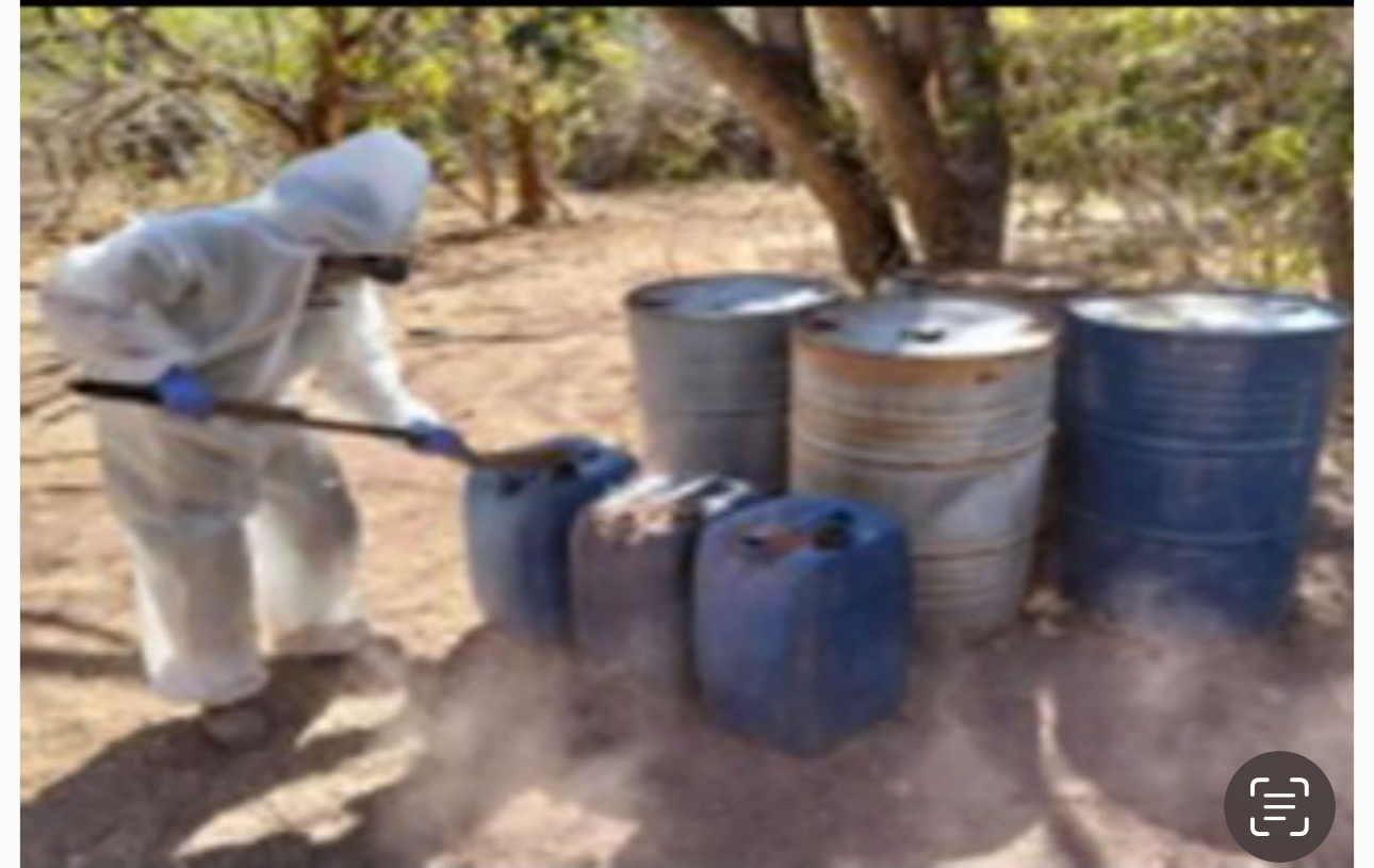 Durante trabajos de reconocimiento en los municipios de Culiacán y Cosalá, personal militar localizó asentamientos utilizados para la fabricación de drogas sintéticas, donde se encontraron diversas sustancias químicas, centrifugadoras, coladores, bidones, tambos, barriles, costales, condensadores y tinas.