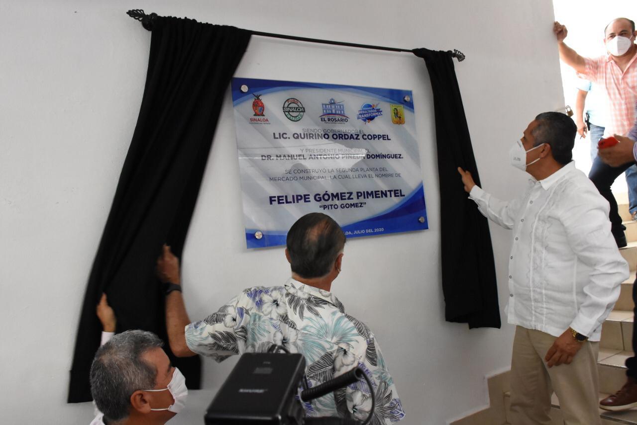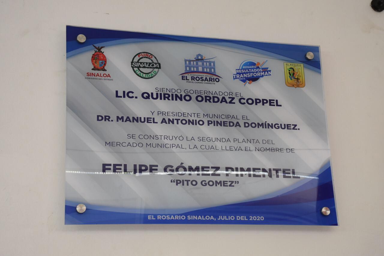 El alcalde Dr. Manuel Pineda Domínguez y el gobernador Quirino Ordaz Coppel develaron la placa en el interior de esta nuevo segundo piso, que llevara por nombre Felipe “Pito” Gómez Pimentel, quien en vida fuera líder de los locatarios de este mercado y uno de los principales impulsores del proyecto.