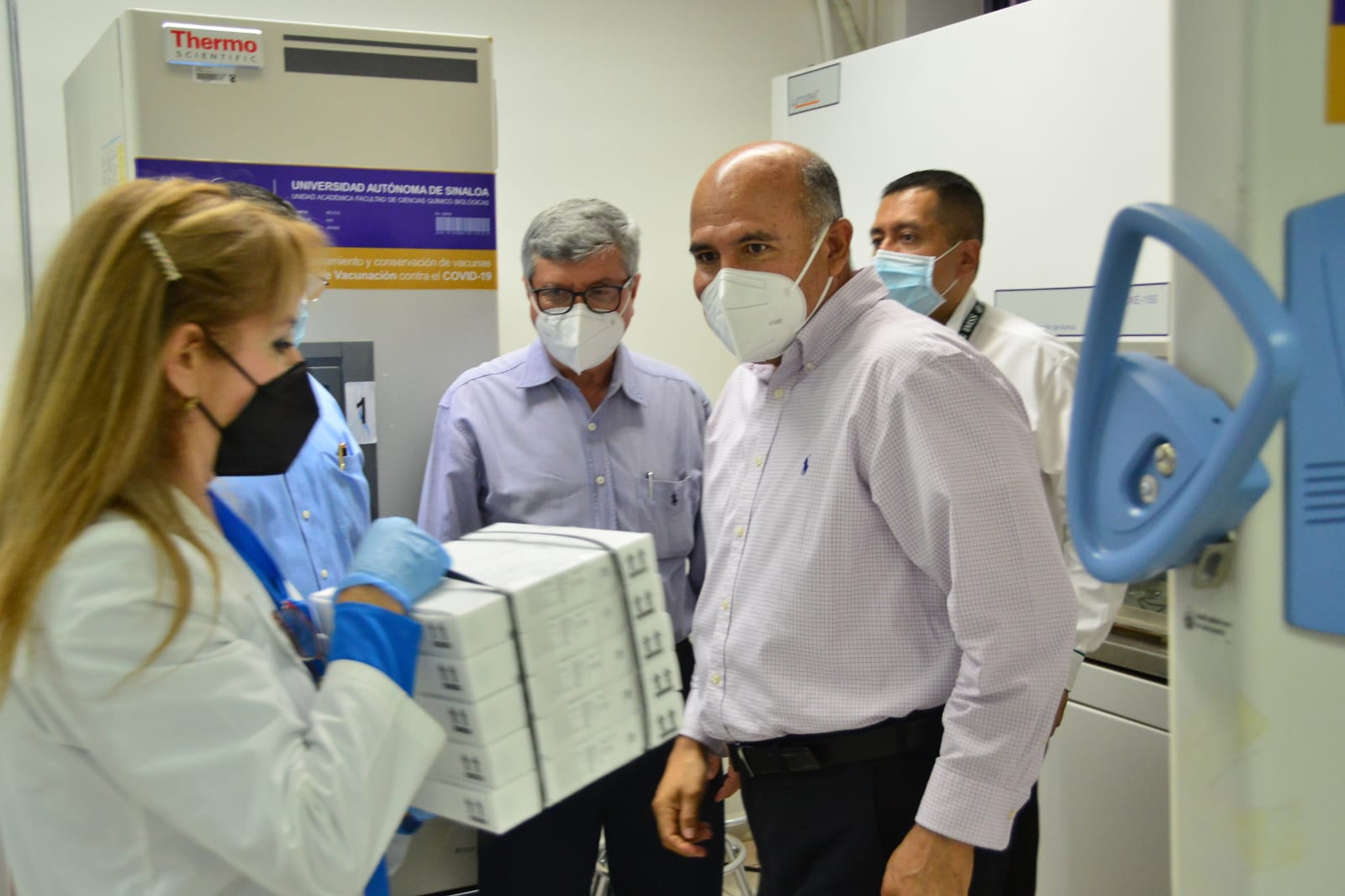 Informo además que en presencia de los Delegados del IMSS y Bienestar en Sinaloa, Luis Rafael López Ocaña y Jaime Montes Salas, además del Secretario General de la UAS, Gerardo Alapizco y representas de las fuerzas armadas encabezadas por el General Vinicio Perea, se resguardaron estas vacunas en la Facultad de Ciencias Biológicas para, una vez que se tenga la programación de cada lugar a aplicar,enviarlas.
