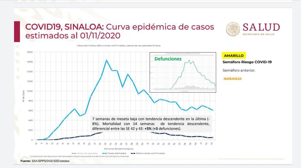 Culiacán, Sinaloa, noviembre del 2020; A siete semanas de que Sinaloa presente una meseta baja con tendencia descendente en la última (-8%) y de mortandad con 14 semanas descendente, el Secretario de Salud de Sinaloa, Dr. Efrén Encinas Torres, llama a la población a no bajar la guardia y continuar en la lucha para evitar rebrotes como en otros países.