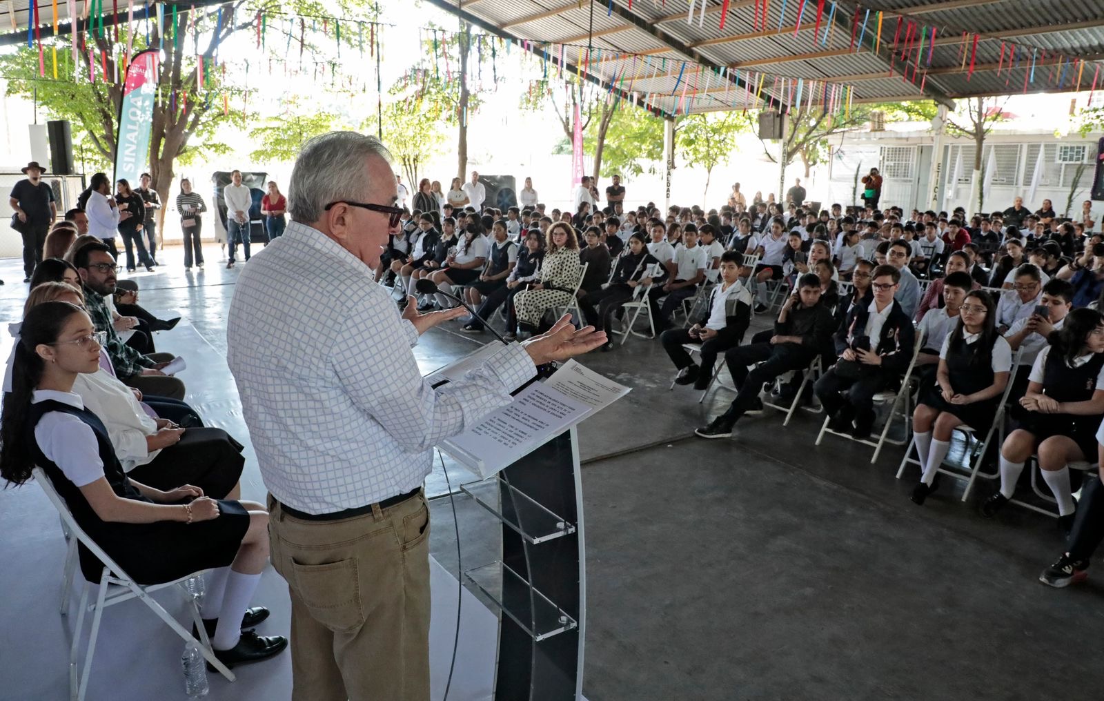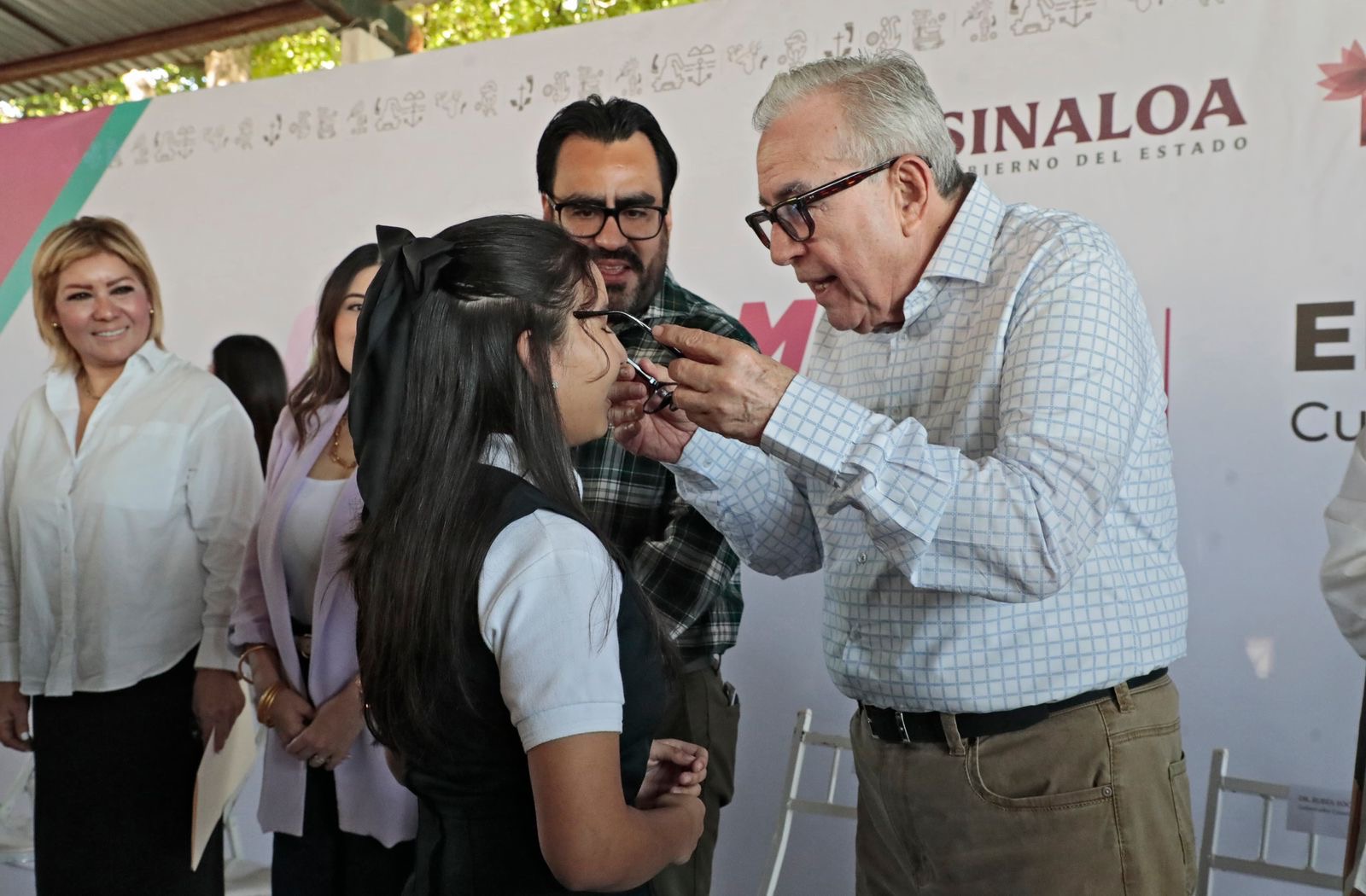 El mandatario estatal y la doctora Eneyda Rocha asistieron a este plantel donde fueron recibidos por la secretaria de Educación Pública y Cultura, Gloria Himelda Félix Niebla, y por el presidente municipal de Culiacán, Juan de Dios Gámez Mendívil, para entregar 365 lentes, que corresponden 262 para alumnos del turno matutino y 103 para estudiantes del turno vespertino.