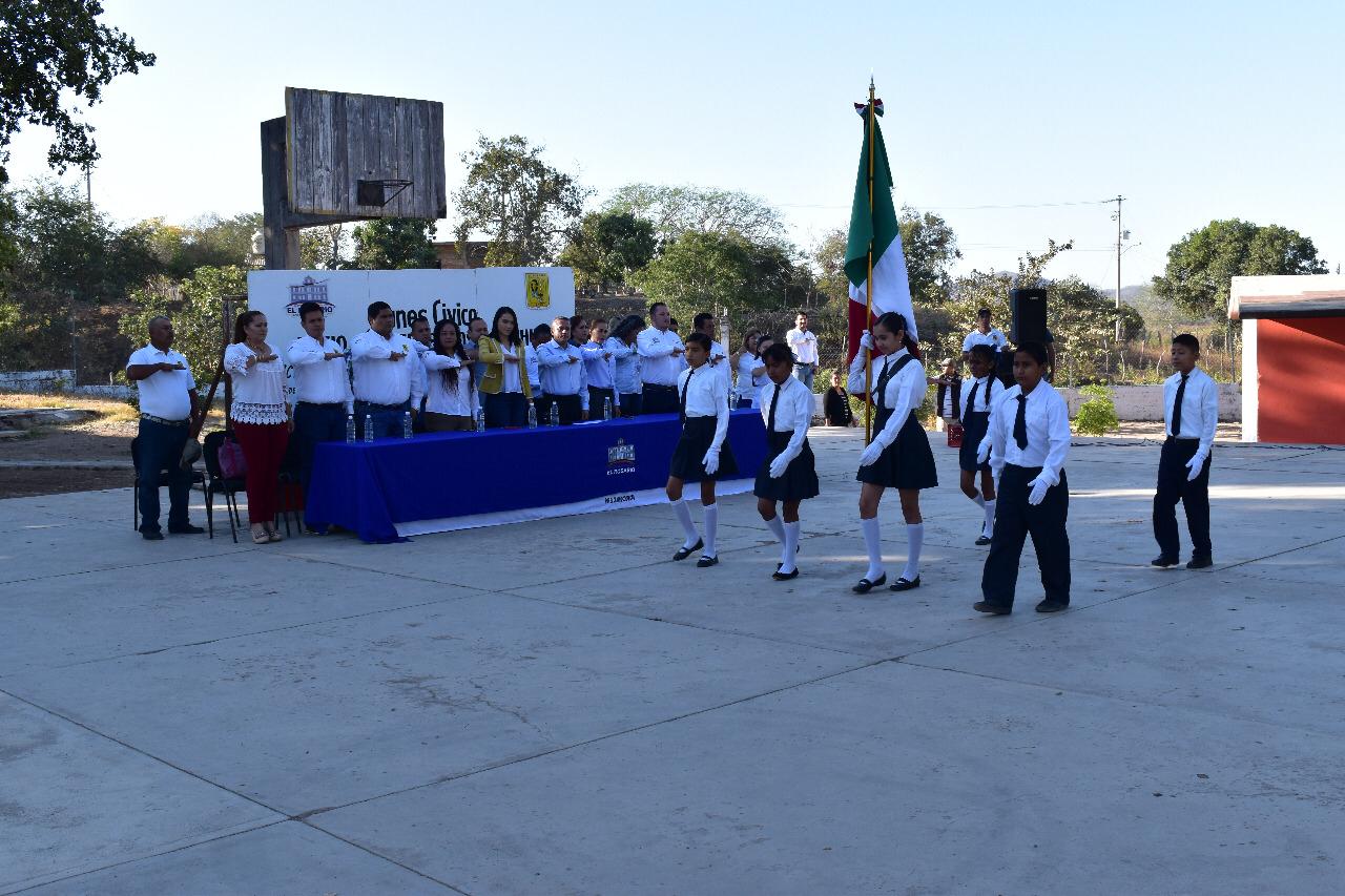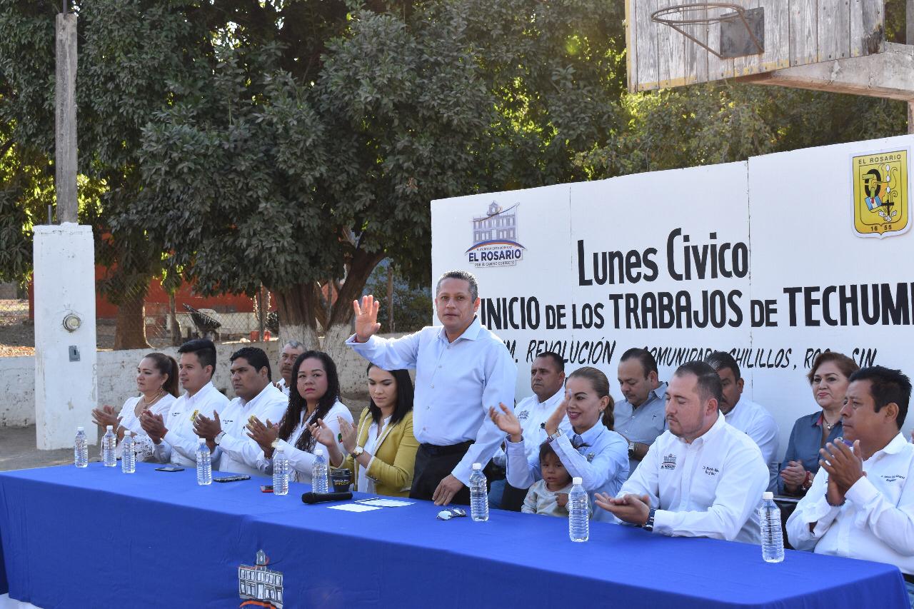 Chilillos, Rosario, Sinaloa, 08 de abril de 2019.- El alcalde Manuel Pineda, dio el banderazo de inicio de los trabajos para la construcción de una techumbre metálica, en la escuela primaria de esta comunidad, en la que hoy se llevó a cabo el Lunes Cívico.