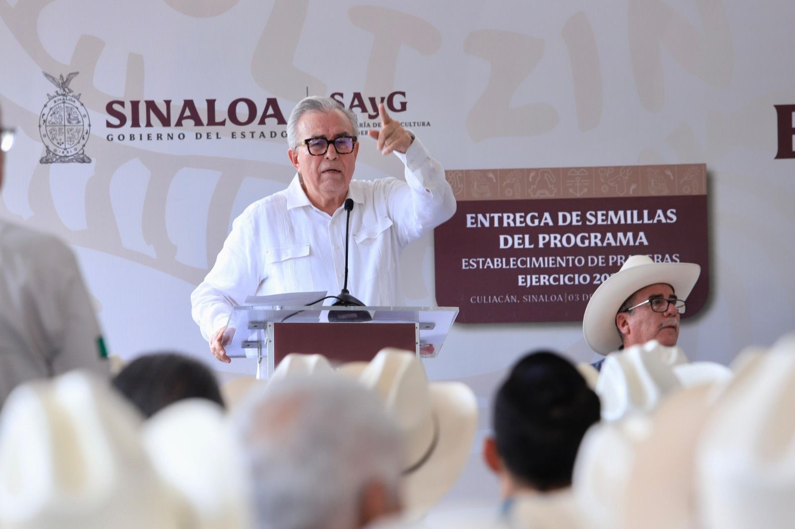 Culiacán, Sinaloa 03 de julio de 2024.- El Gobernador Dr. Rubén Rocha Moya encabezó la entrega de semilla para el programa de establecimiento de praderas y garantizar el alimento para el ganado. Durante su intervención el mandatario exhortó a las autoridades y ganaderos a que se realicen los trabajos necesarios para poder rescatar el estatus zoosanitario en Sinaloa, en beneficio de los pequeños y medianos productores engordadores de ganado.