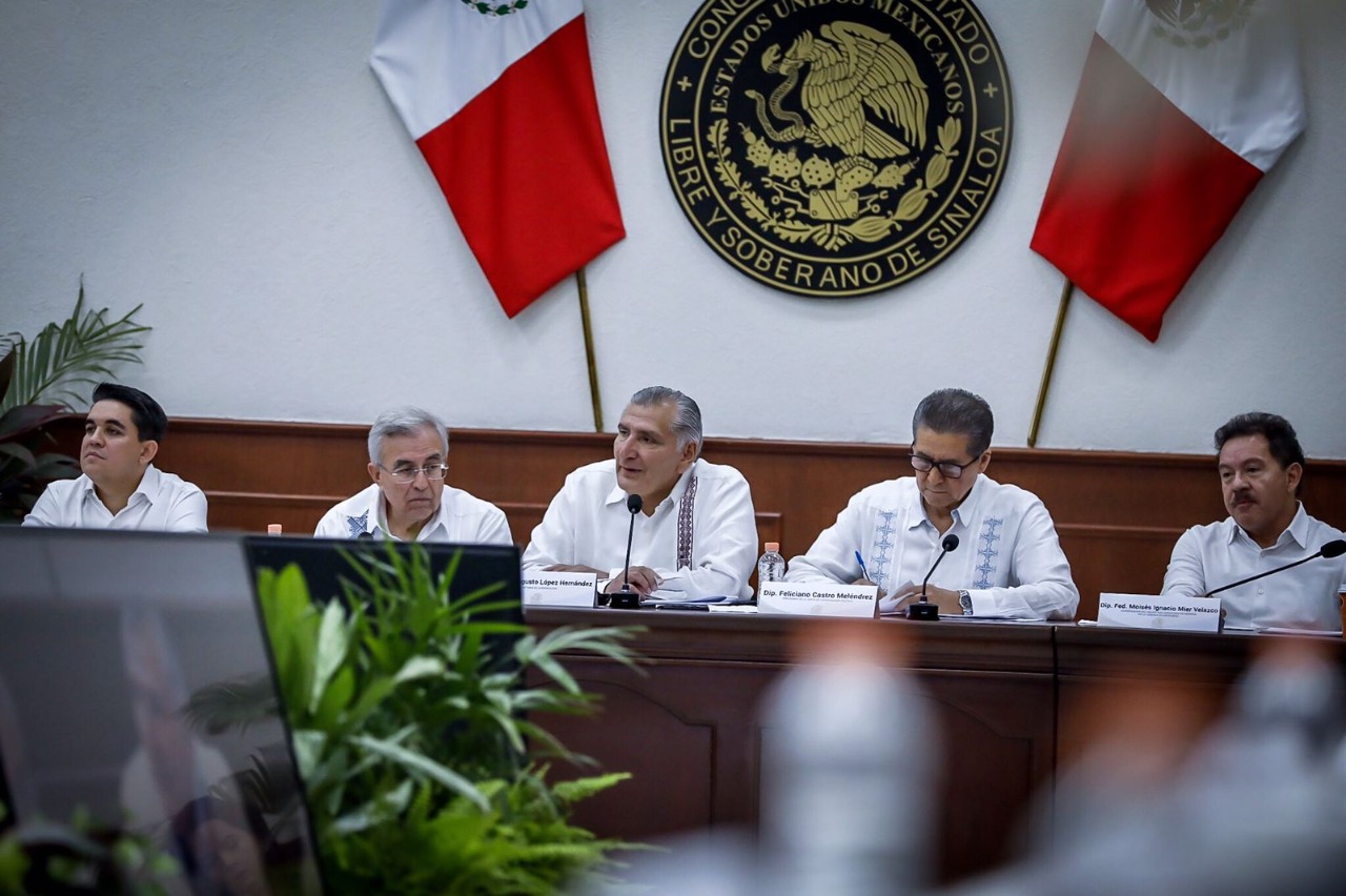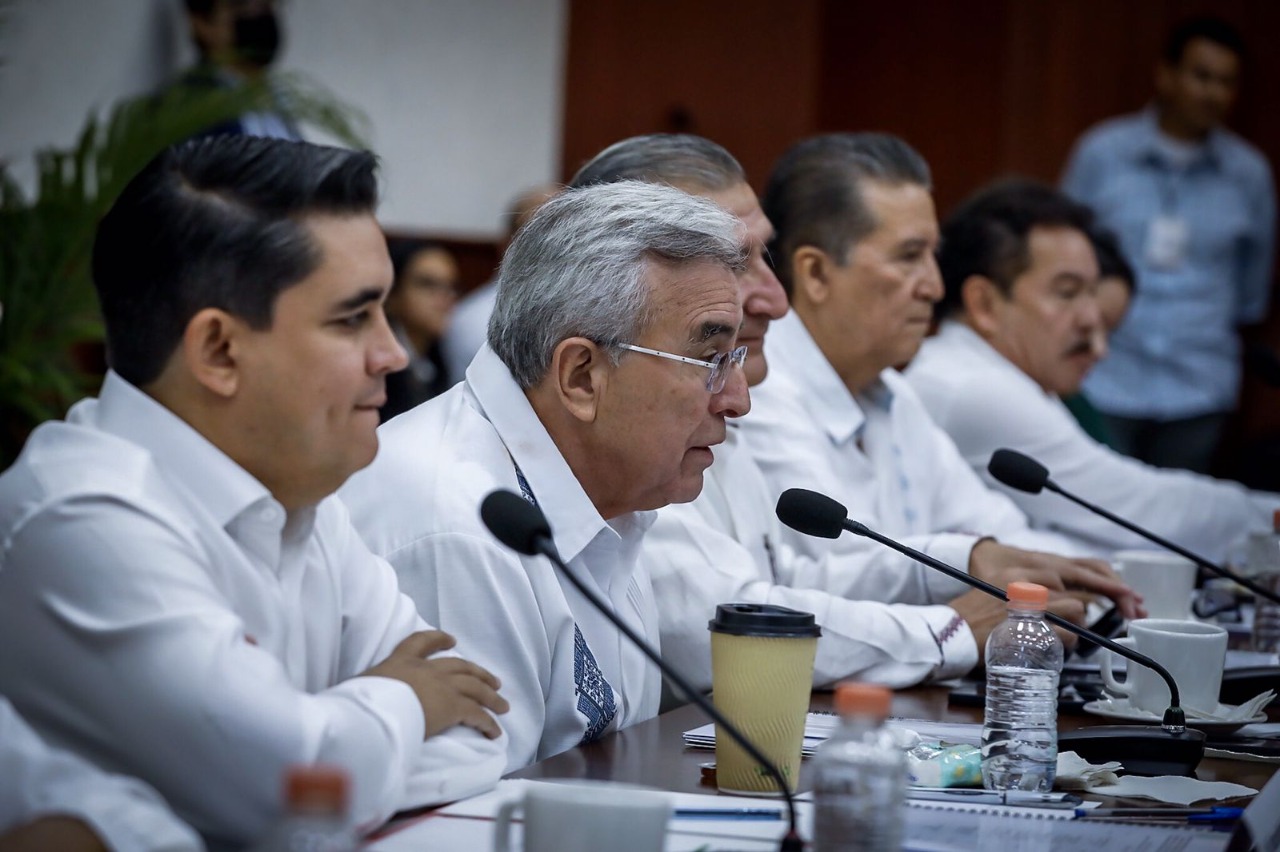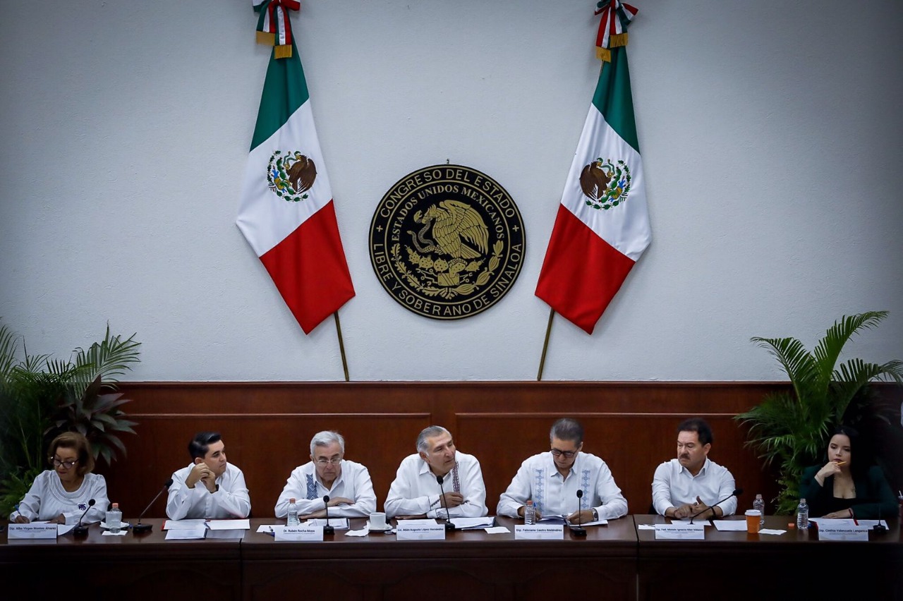 Culiacán, Sinaloa, a 14 de Octubre de 2022.- En las instalaciones del Congreso del Estado, en el marco de la reunión de socialización con legisladores locales de la minuta de reforma constitucional que contiene la ampliación del plazo para la coadyuvancia de la Guardia Nacional en tareas de seguridad, encabezada por Adán Augusto López Hernández, Secretario de Gobernación Federal y Moisés Ignacio Mier Velazco, Presidente de la Junta de Coordinación Política de la Cámara de Diputados, el Gobernador Rubén Rocha Moya, tras escuchar los distintos puntos de vista de las fracciones parlamentarias, planteó la importancia de construir consensos que permitan la permanencia de las autoridades federales en las labores de seguridad pública.