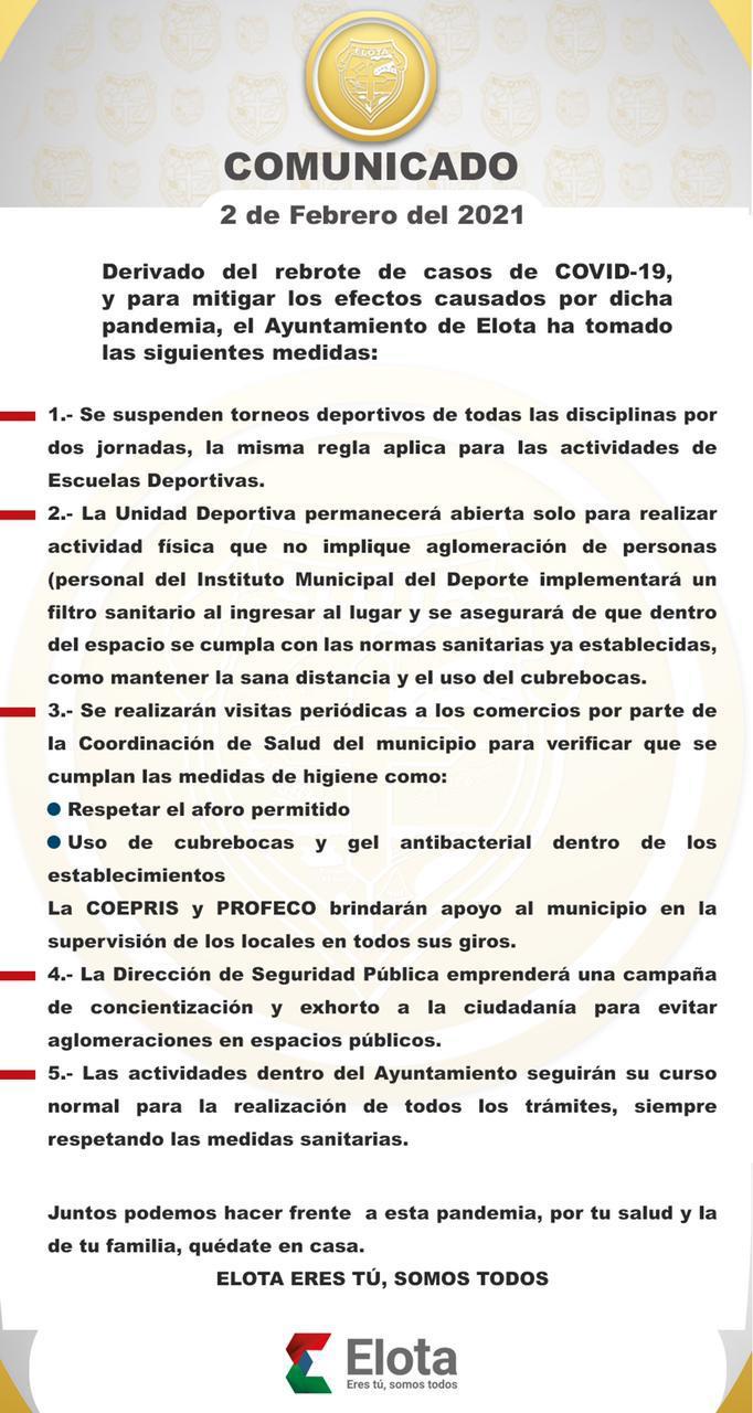 Mediante un comunicado, se informó a los elotenses sobre las nuevas medidas implementadas, las cuales implican los siguientes puntos: