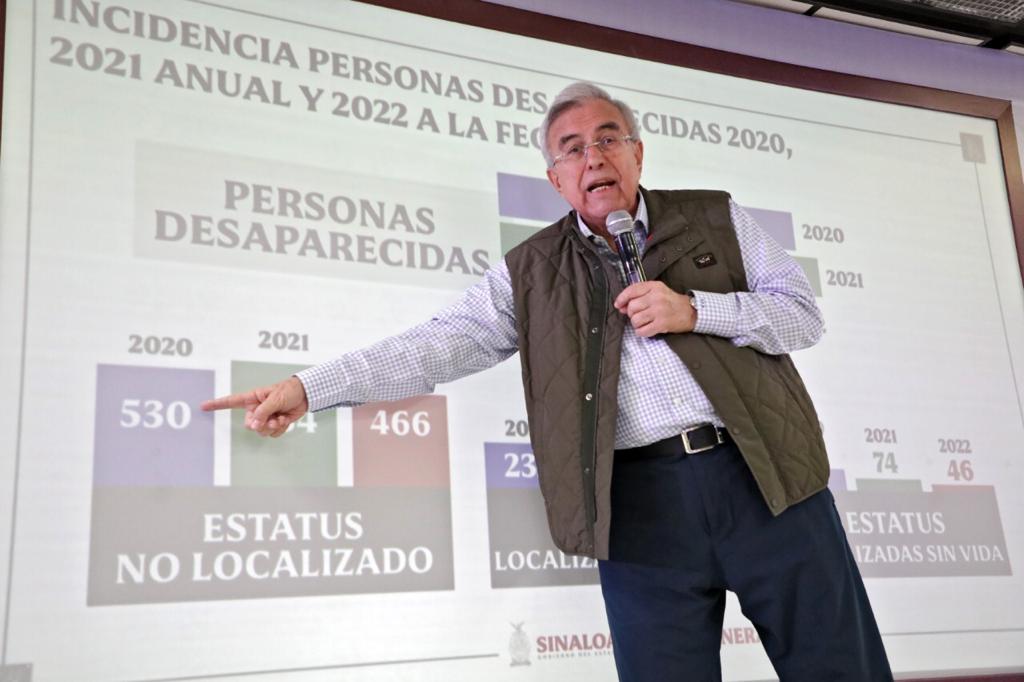 El gobernador Rocha se refirió a otro de los delitos de alto impacto, como son las desapariciones forzadas, donde también se tiene una disminución considerable en los últimos tres años, considerando el 2020 y 2021, del anterior sexenio, así como el 2022 que corresponde a su gobierno.