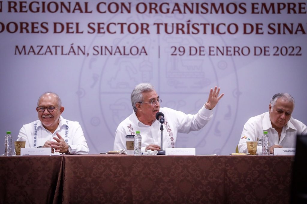 Mazatlán, Sinaloa, a 29 de enero de 2022.- Durante un encuentro con empresarios turísticos y prestadores de servicios tanto de Sinaloa como de Durango, el gobernador Rubén Rocha Moya señaló que el objetivo fijado por su gobierno es que Mazatlán continúe con este repunte en el turismo, y aprovechar la vecindad entre ambas ciudades para complementar la oferta turística que también ofrece la ciudad de Durango.