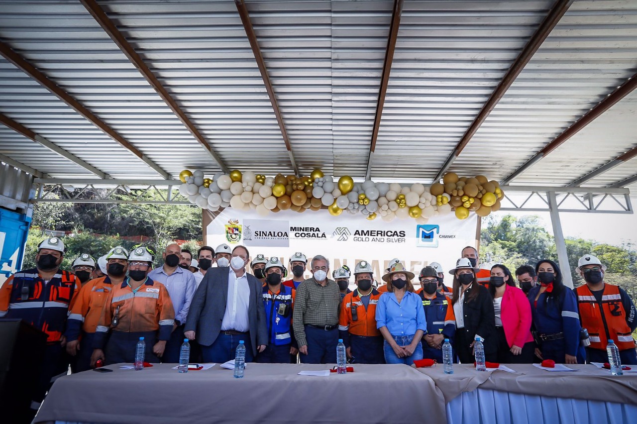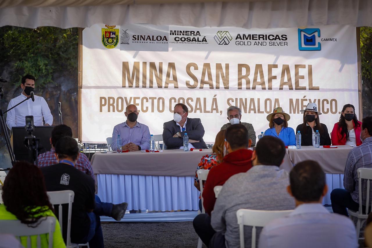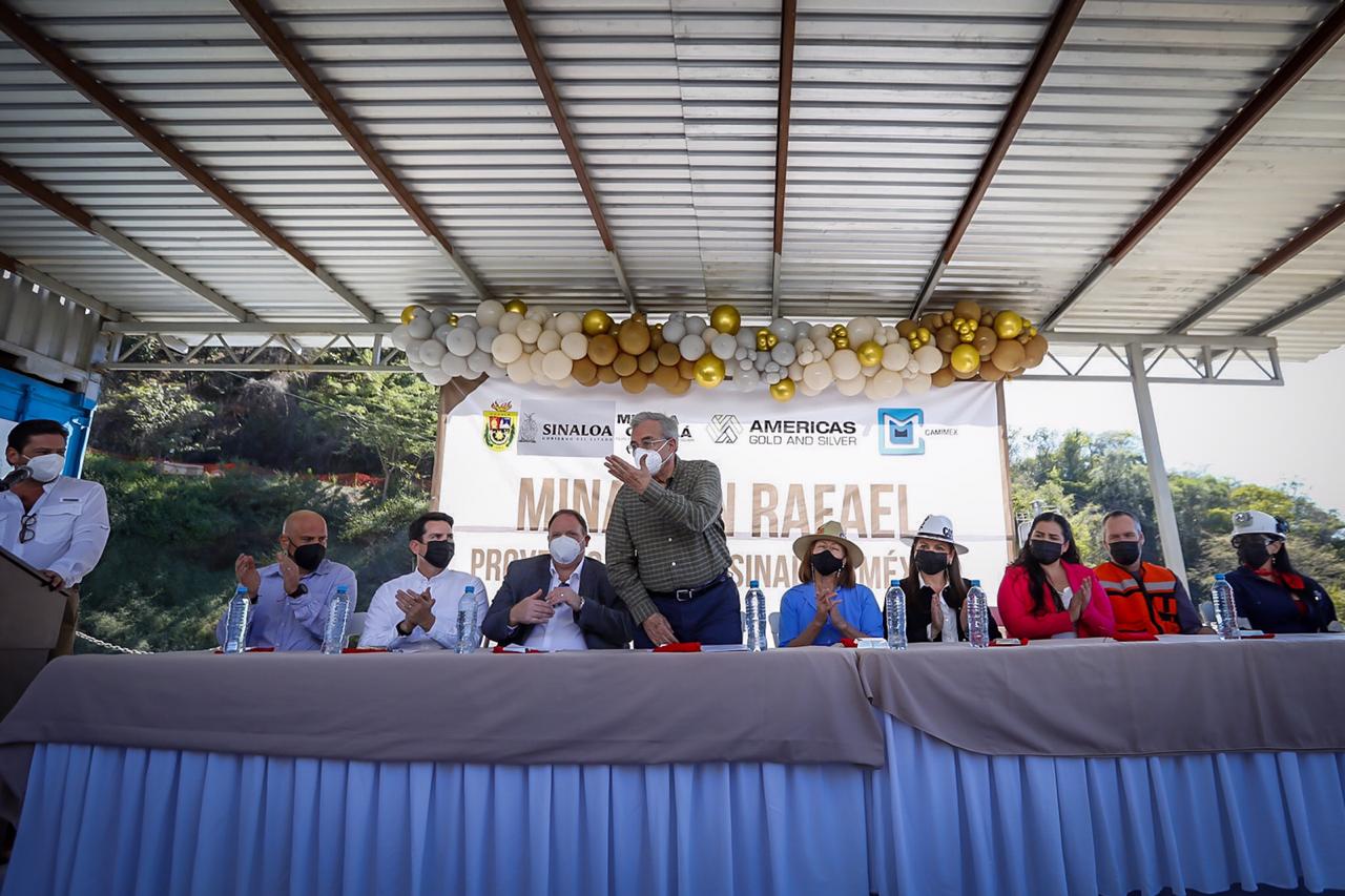 Cosalá, Sinaloa, a 21 de enero de 2022.- Luego de un largo periodo de 19 meses en los cuales estuvo cerrada, la mina San Rafael, de la empresa canadiense America’s Gold & Silver, reinició operaciones, con una inversión de 30 millones de dólares, que son más de 600 millones de pesos, y para ello, el gobernador Rubén Rocha Moya, acompañado por la secretaria de Economía, Tatiana Clouthier Carrillo, puso en marcha los trabajos de reapertura de esta empresa que genera 300 empleos permanentes.