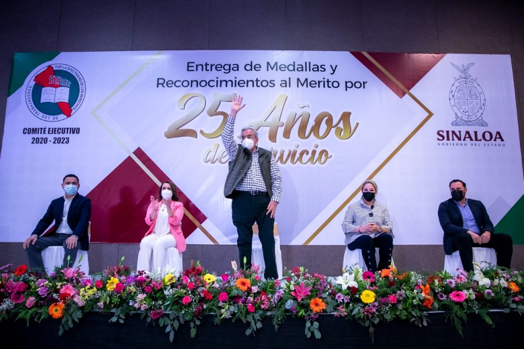 •El gobernador Rubén Rocha Moya encabezó la ceremonia donde el Gobierno del Estado de Sinaloa reconoció a 153 trabajadores por sus 25 años de servicio en la administración pública, evento que tuvo lugar en el FigloStase, en presencia de la secretaria general del Sindicato de Trabajadores al Servicio del Estado (STASE), Teresita de Jesús Ochoa.