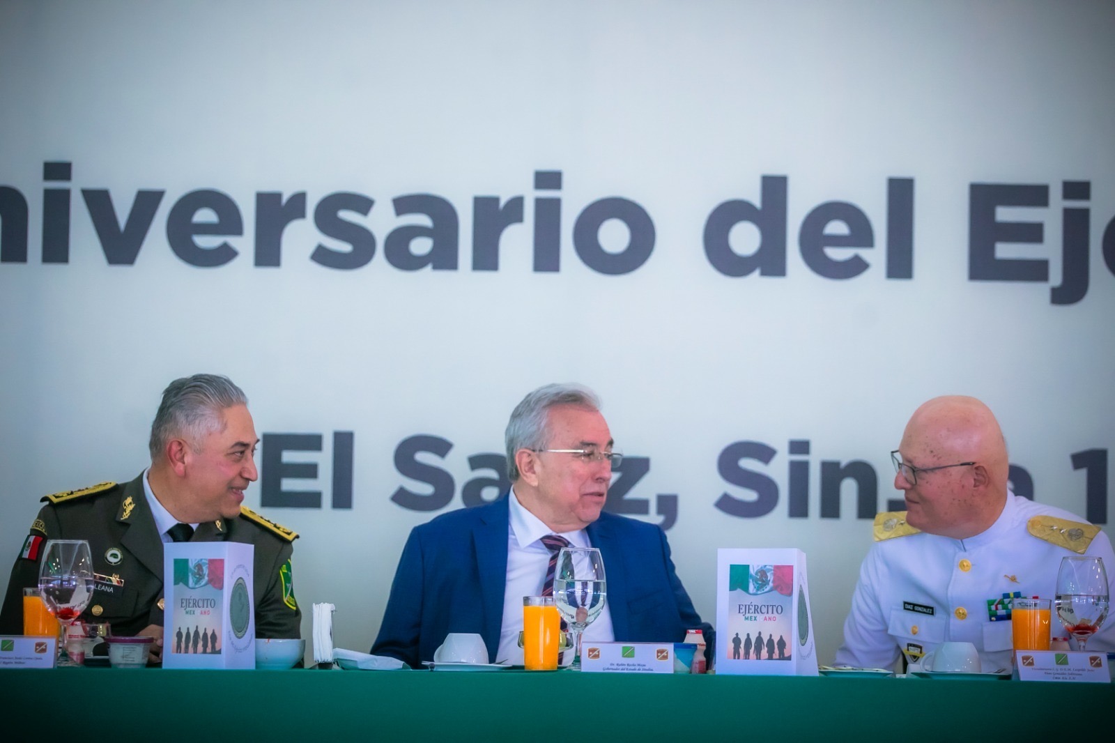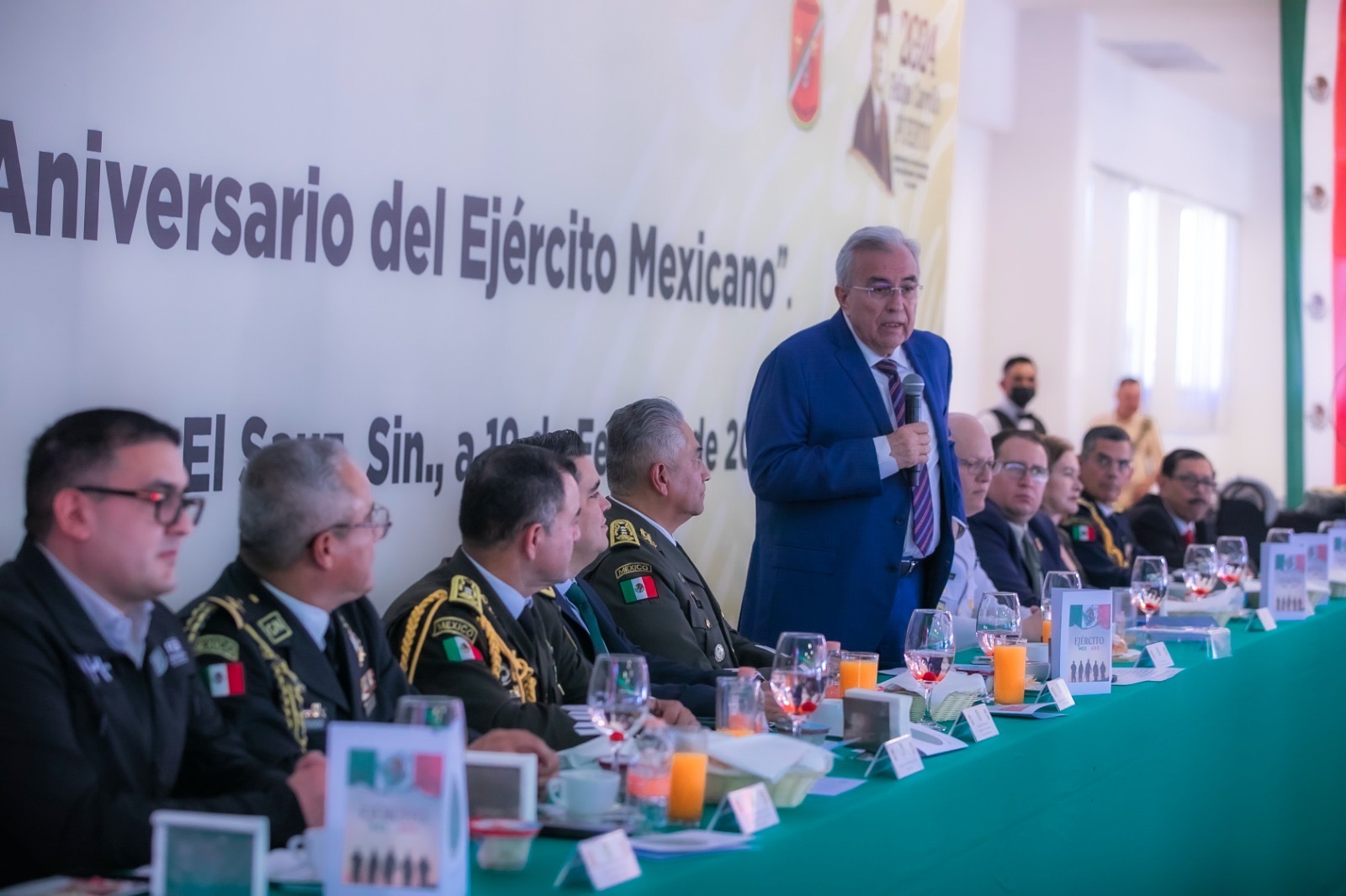 El Sauz, Culiacán, Sinaloa, a 19 de febrero de 2024.- En el marco del 111 aniversario de la creación del Ejército Mexicano, el gobernador Rubén Rocha Moya reconoció que los mexicanos tenemos mucho respeto por esta institución militar, que se ha distinguido de todos los ejércitos de América por nunca haber tenido la codicia de intentar algún golpe de Estado para arrebatar el poder político de la Nación, como sí ha ocurrido en otros países de Latinoamérica.