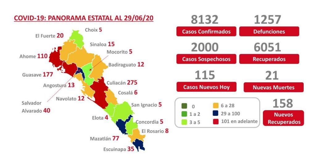 El secretario de Salud en la entidad, Efrén Encinas Torres, informó que este 28 de junio del 2020, Sinaloa registró 115 nuevos casos de Covid-19, con lo que se llega a 824 casos activos, 64 menos que el total de ayer domingo, en virtud de que las últimas 24 horas se registraron también 21 decesos y 158 pacientes recuperados.