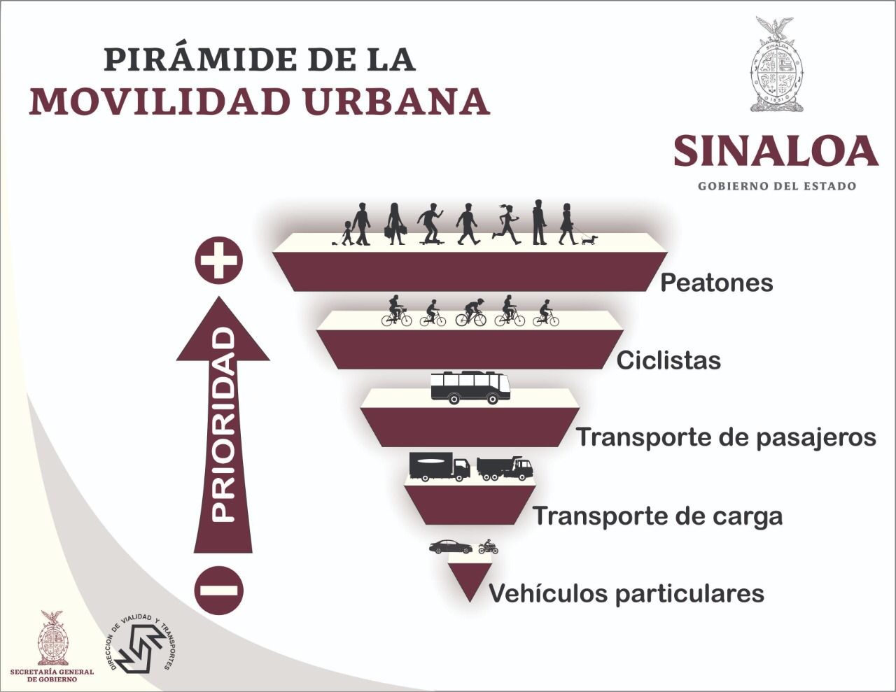 De acuerdo a la Pirámide de Movilidad, terminó, para el uso del espacio público deben tener preferencia, en ese orden de importancia, los peatones y discapacitados; las bicicletas, los operadores y usuarios del transporte de pasajeros (transporte urbano) y de cargas livianas, y al final de esta escala los vehículos particulares (autos y motos).