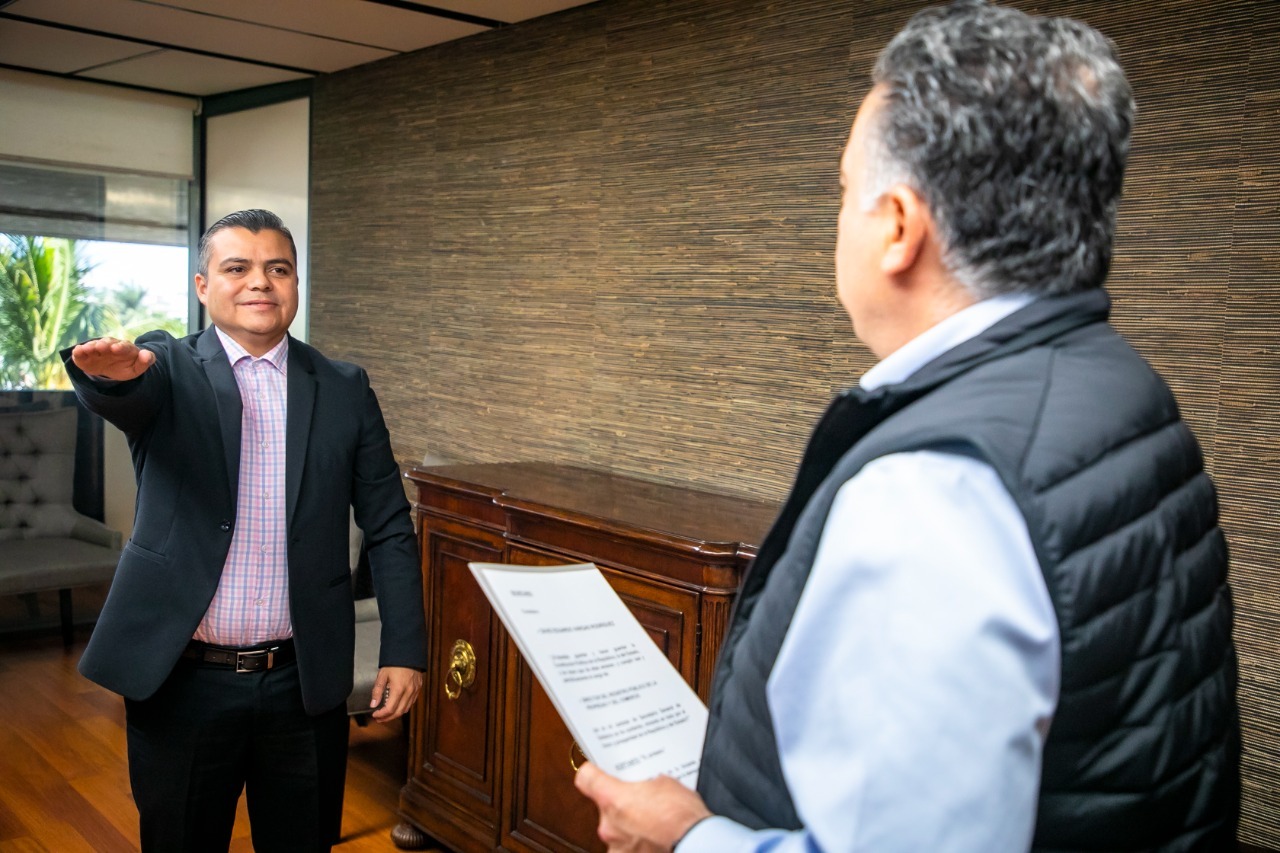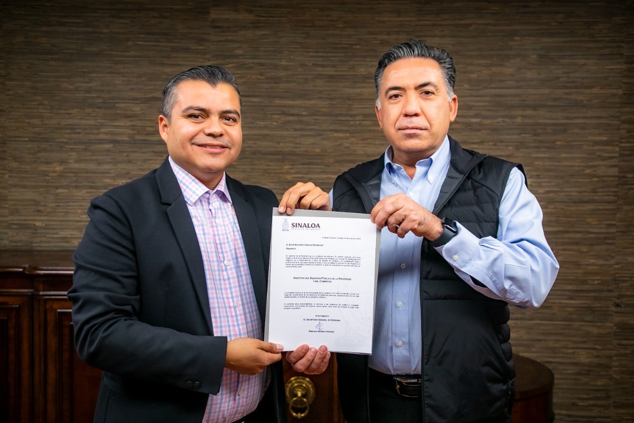 Culiacán, Sinaloa, a 06 de enero de 2023.- El secretario General de Gobierno Enrique Inzunza Cázarez tomó protesta a David Eduardo Vargas Rodríguez como el nuevo director del Registro Público de la Propiedad y del Comercio, quien se incorporará al trabajo de esta secretaría a partir de este día.