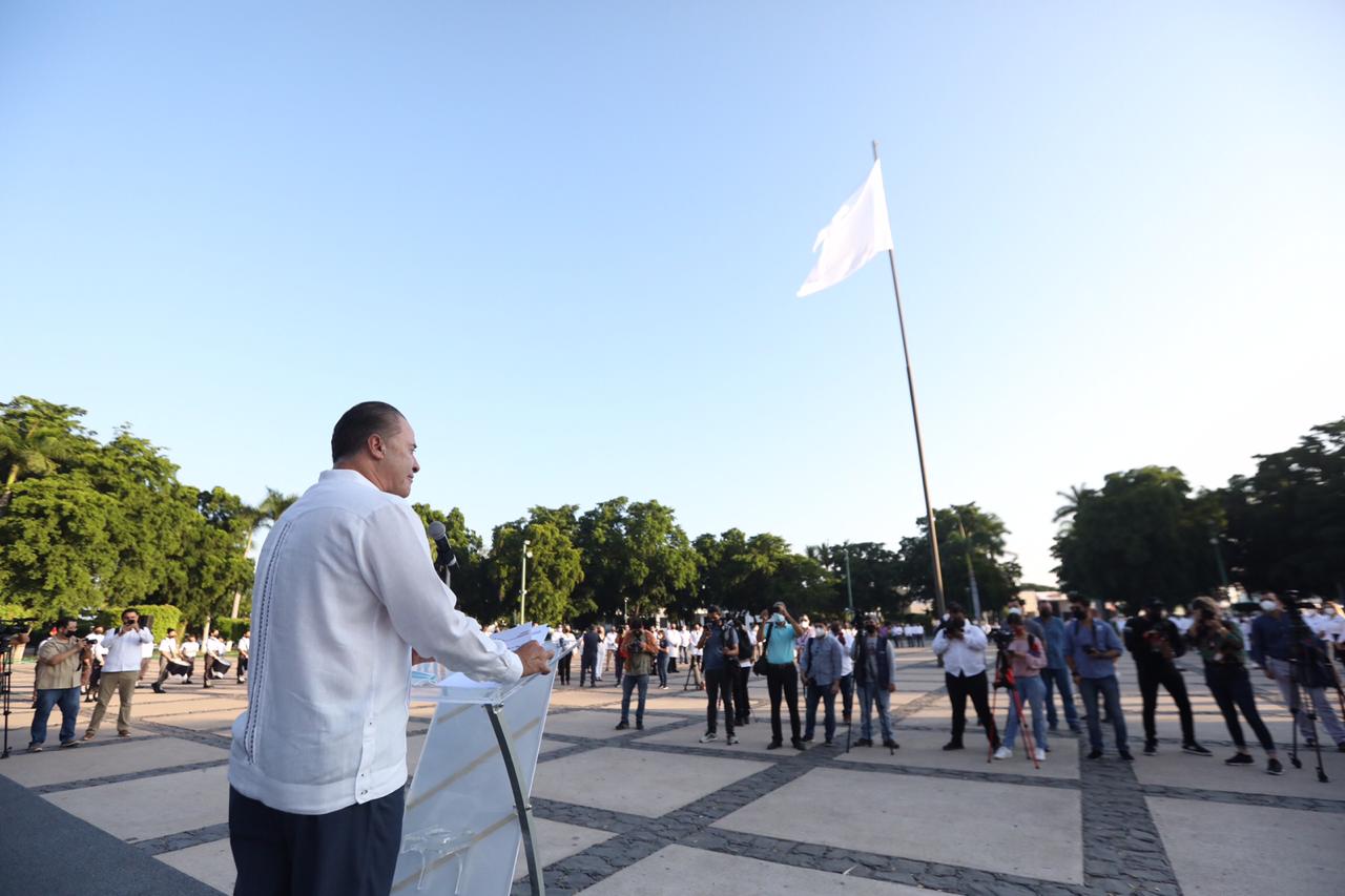 Culiacán, Sinaloa, a 23 de octubre del 2020.- Como un justo homenaje a los Héroes de la Pandemia 2020, que es el personal del sector salud que ofrendó su vida en atención a los pacientes contagiados con el COVID 19, el gobernador Quirino Ordaz Coppel encabezó una sentida ceremonia en la explanada de Palacio de Gobierno donde izó a toda asta una bandera blanca, en el marco del Día del Médico que en todo México se conmemora cada 23 de octubre desde 1937.