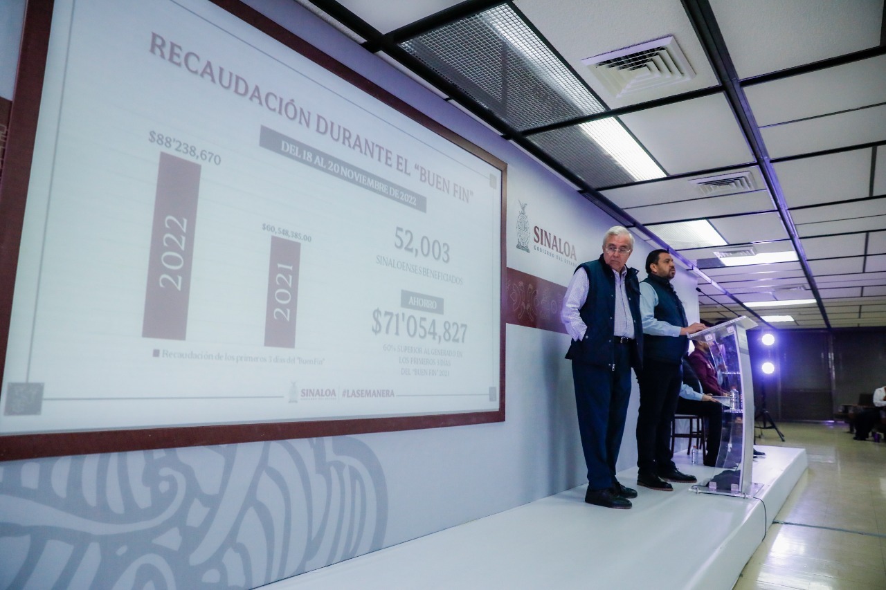 Culiacán, Sinaloa, a 21 de noviembre de 2022.- Durante su Conferencia Semanera, el gobernador Rubén Rocha Moya anunció que los descuentos en trámites vehiculares que se ofrecen actualmente como parte del programa del Buen Fin, el cual concluye este lunes, se ampliarán hasta el 30 de noviembre, para extender a la ciudadanía la oportunidad de regularizar sus adeudos, pues gracias a la buena respuesta en lo que va de este programa que inició el pasado viernes 18, en total más de 52 mil contribuyentes se han ahorrado 71 millones 54 mil pesos, cifra superior en un 60 por ciento con respecto al mismo periodo del Buen Fin de 2021.