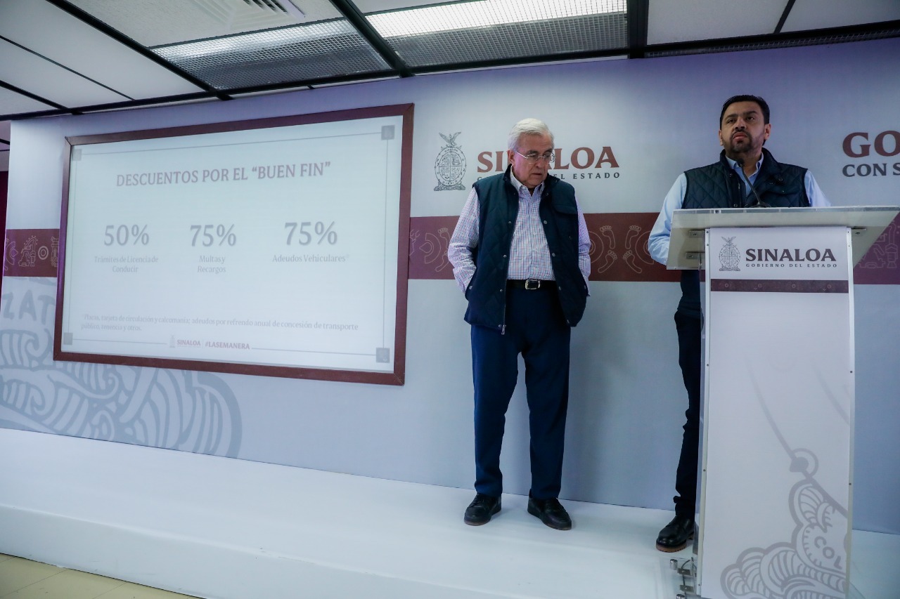 El mandatario estatal invitó a su Conferencia al director del Servicio de Administración Tributaria de Estado de Sinaloa (SATES), Ismael Bello Esquivel, para que rindiera un reporte del avance del programa de descuentos en trámites vehiculares con motivo del Buen Fin, que este año se lleva a cabo en todo el país del 18 al 21 de noviembre.