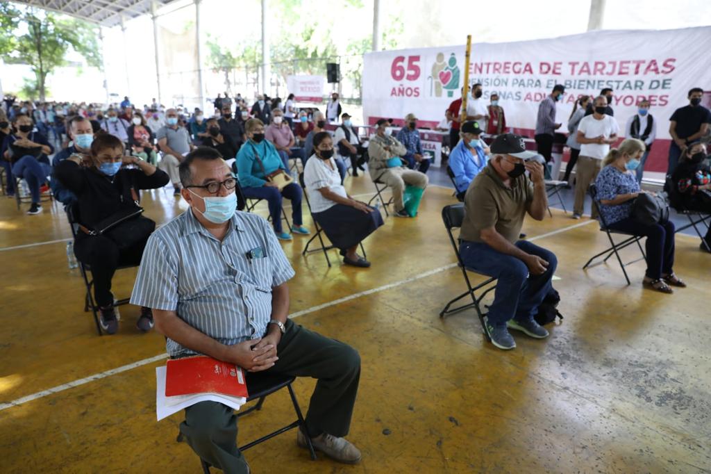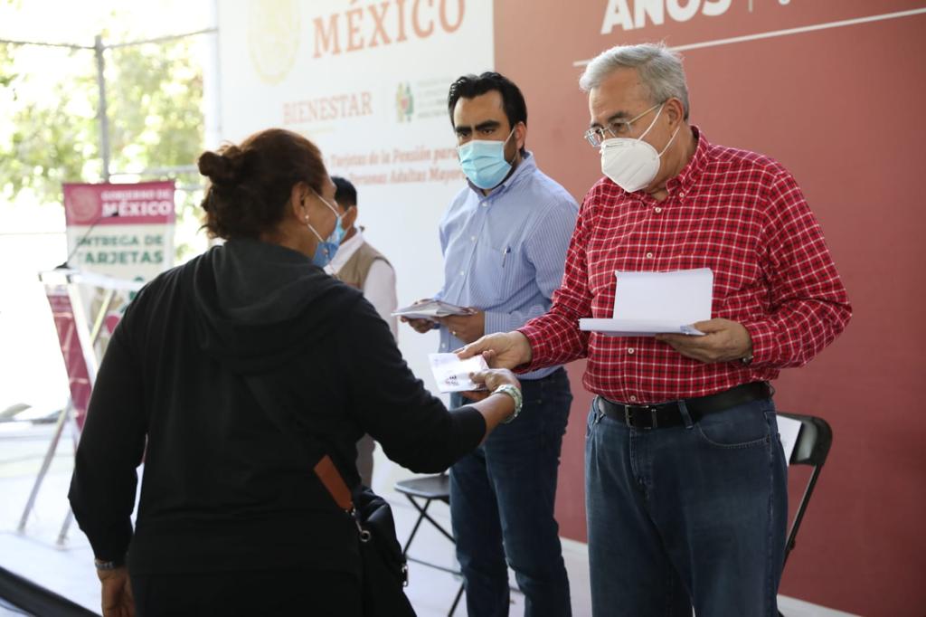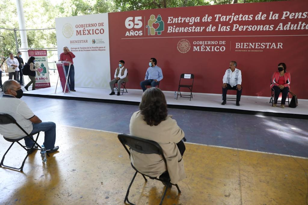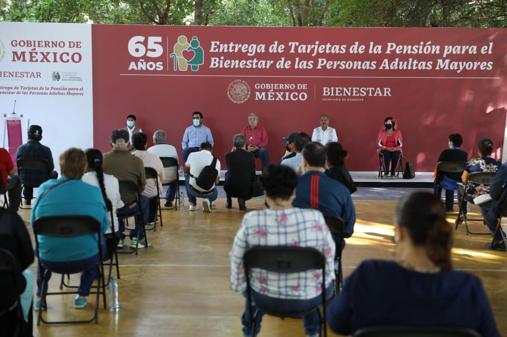 Culiacán, Sinaloa, a 21 de noviembre de 2021. – Al hacer entrega de Tarjetas de la Pensión para el Bienestar de las Personas Adultas Mayores, el gobernador Rubén Rocha Moya señaló que este apoyo les sirve a los beneficiarios para ser autónomos, es decir, que ante la falta de ingresos por haber concluido su vida laboral, no estén a la espera de lo que los hijos les puedan dar, sino a valerse por sí mismos en sus necesidades más básicas.