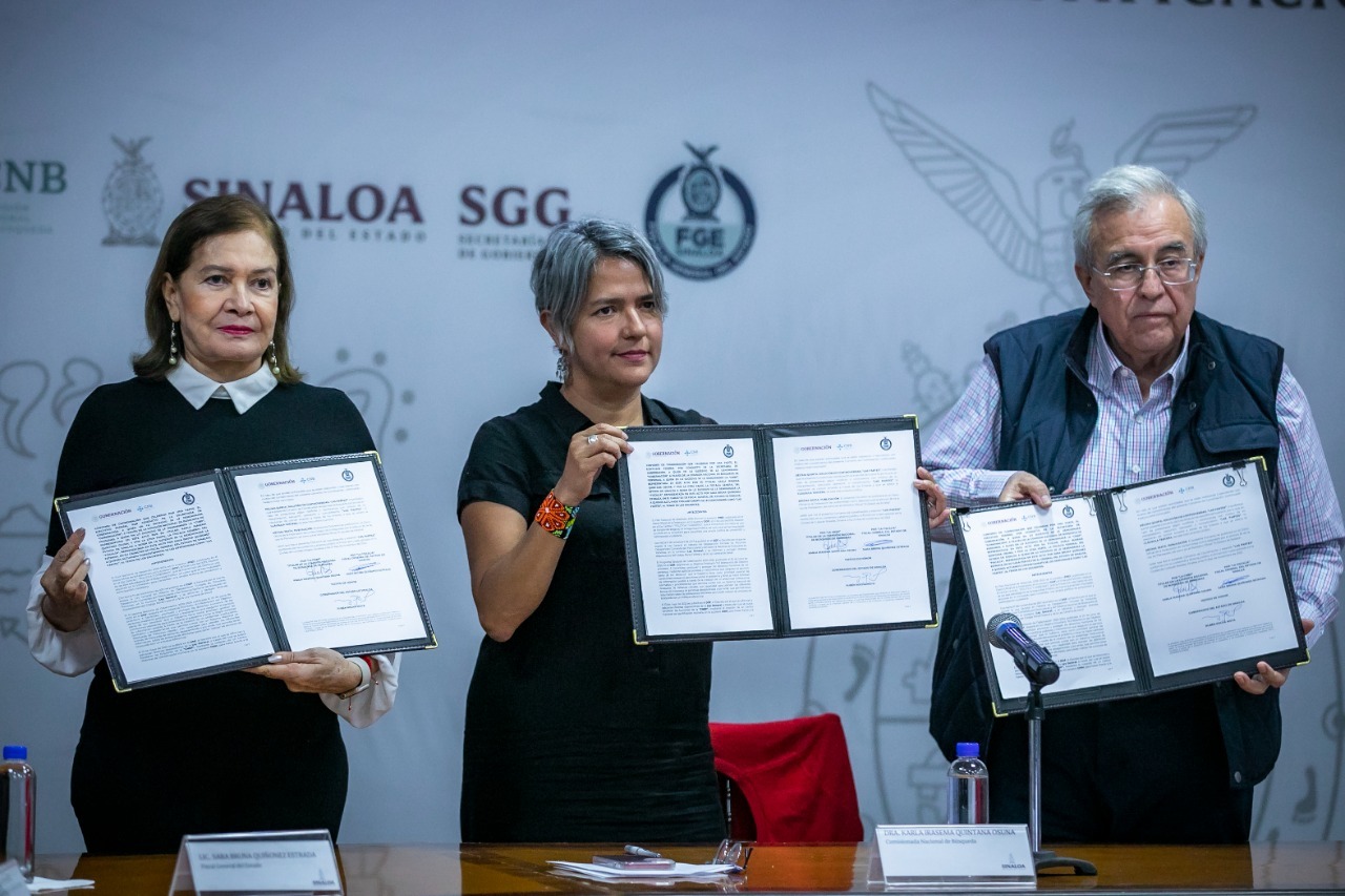 Este compromiso contó con las firmas del mandatario estatal, la presidenta de la Comisión Nacional de Búsqueda Karla Irasema Quintana Osuna y la Fiscal General del Estado de Sinaloa Sara Bruna Quiñones Estrada.