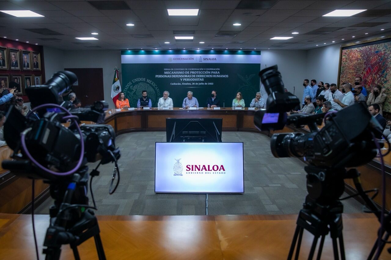 Culiacán, Sinaloa, a 26 de julio de 2022.- En coordinación con la política federal de apoyo total a la protección del periodismo y la libertad de expresión, el Gobernador Rubén Rocha Moya, en conjunto con autoridades federales, realizó la Firma de Convenio de Coordinación y Cooperación del Mecanismo de Protección para Personas Defensoras de Derechos Humanos y Periodistas, con la participación de Alejandro Encinas Rodríguez, Subsecretario de Derechos Humanos, Población y Migración de la SEGOB, Enrique Irazoque Palazuelos, titular de la Unidad para la Defensa de los Derechos Humanos y Karla Quintana, Comisionada Nacional de Búsqueda, ante propietarios y representantes de los principales medios de comunicación.