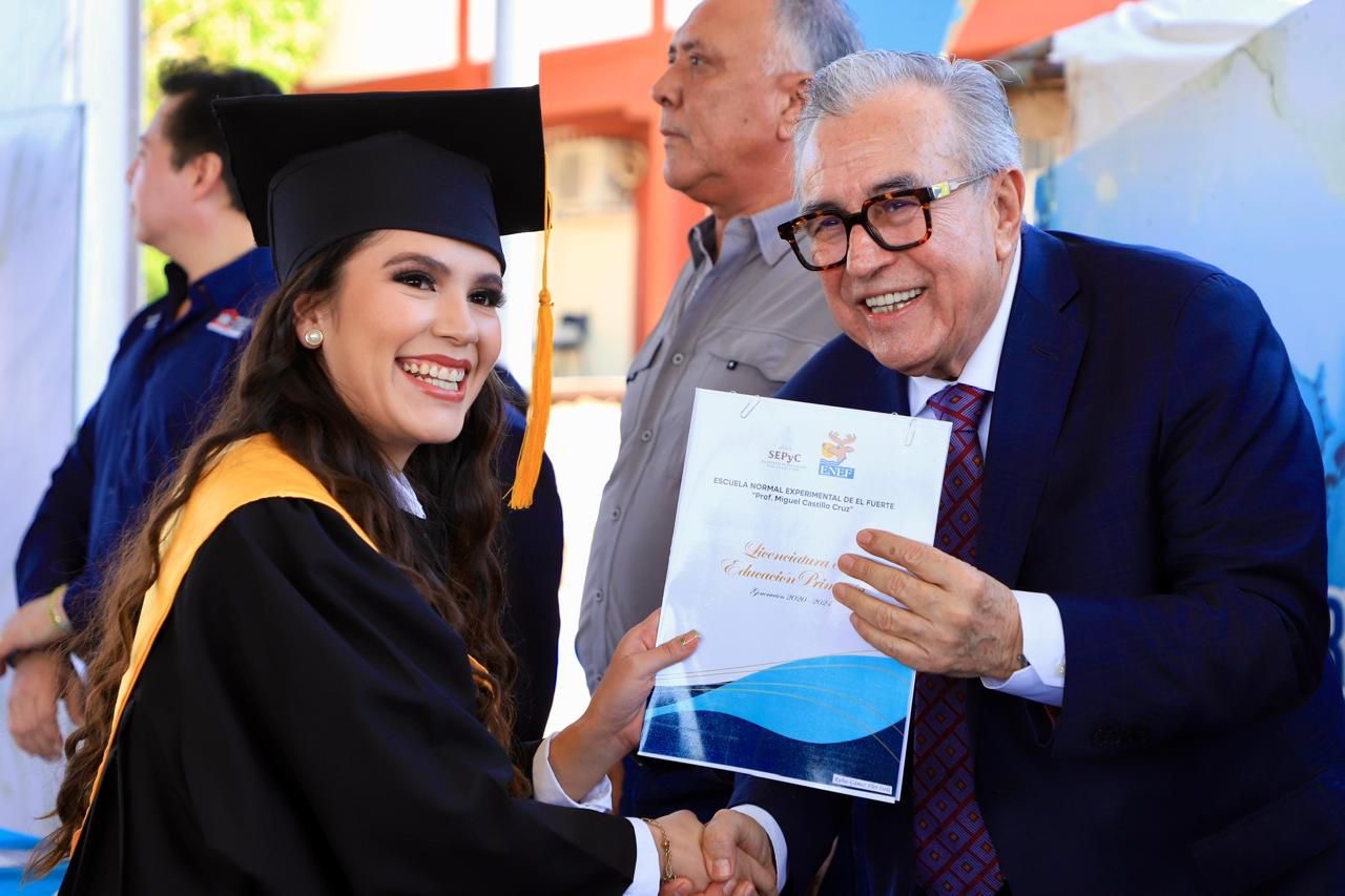 Por este motivo, el gobernador Rocha destacó que es la primera ocasión, como gobernador, que asiste a una ceremonia de graduación, y por ello aceptó con agrado la invitación que le hicieron en la Escuela Normal Experimental de El Fuerte, de entregar sus diplomados a los casi 200 egresados, con quienes compartió el tradicional momento de arrojar al aire sus birretes, como símbolo de fin de cursos.