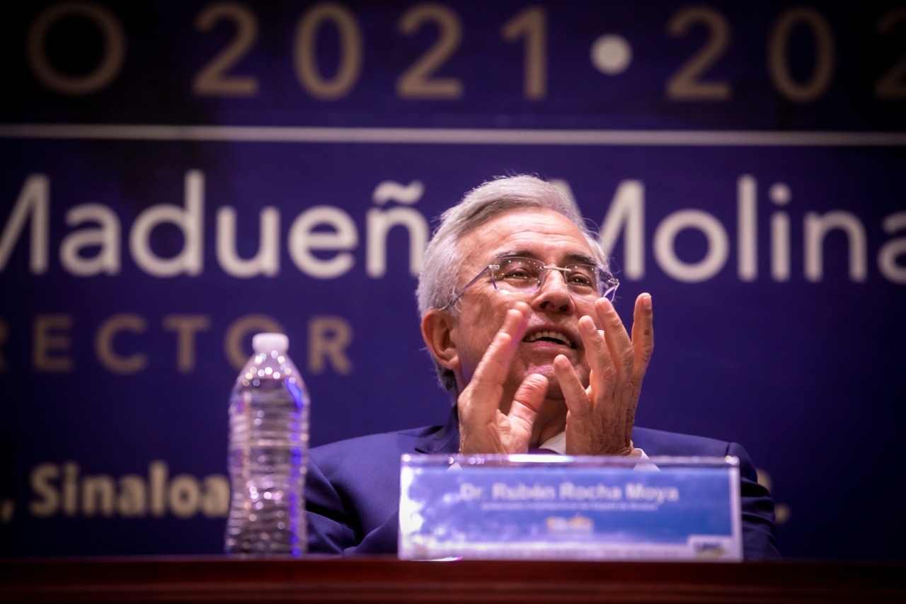 El mandatario estatal asistió como invitado a la sesión solemne del H. Consejo Universitario de la UAS, donde su presidente Jesús Madueña Molina, en su calidad de rector, rindió su primer informe de labores, donde aprovechó para agradecer una vez más el apoyo del gobernador Rocha, quien recordó con satisfacción que tuvo el honor de que fuera su maestro de matemáticas en la preparatoria.