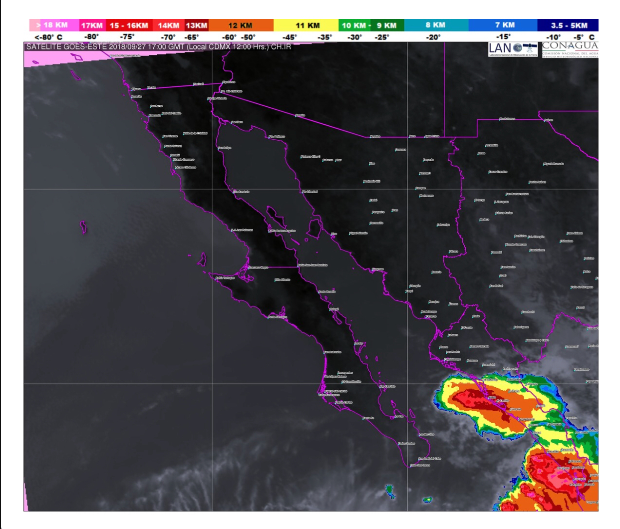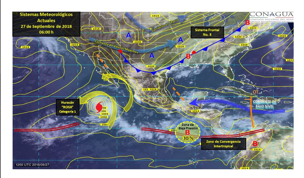 Las bandas nubosas de Rosa originarán tormentas de fuertes a muy fuertes en Sinaloa, Nayarit, Jalisco y Colima, y tormentas fuertes en Baja California Sur.