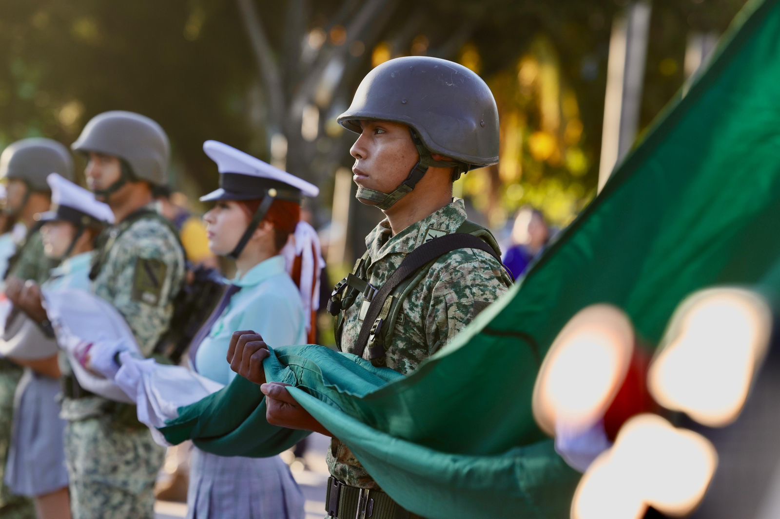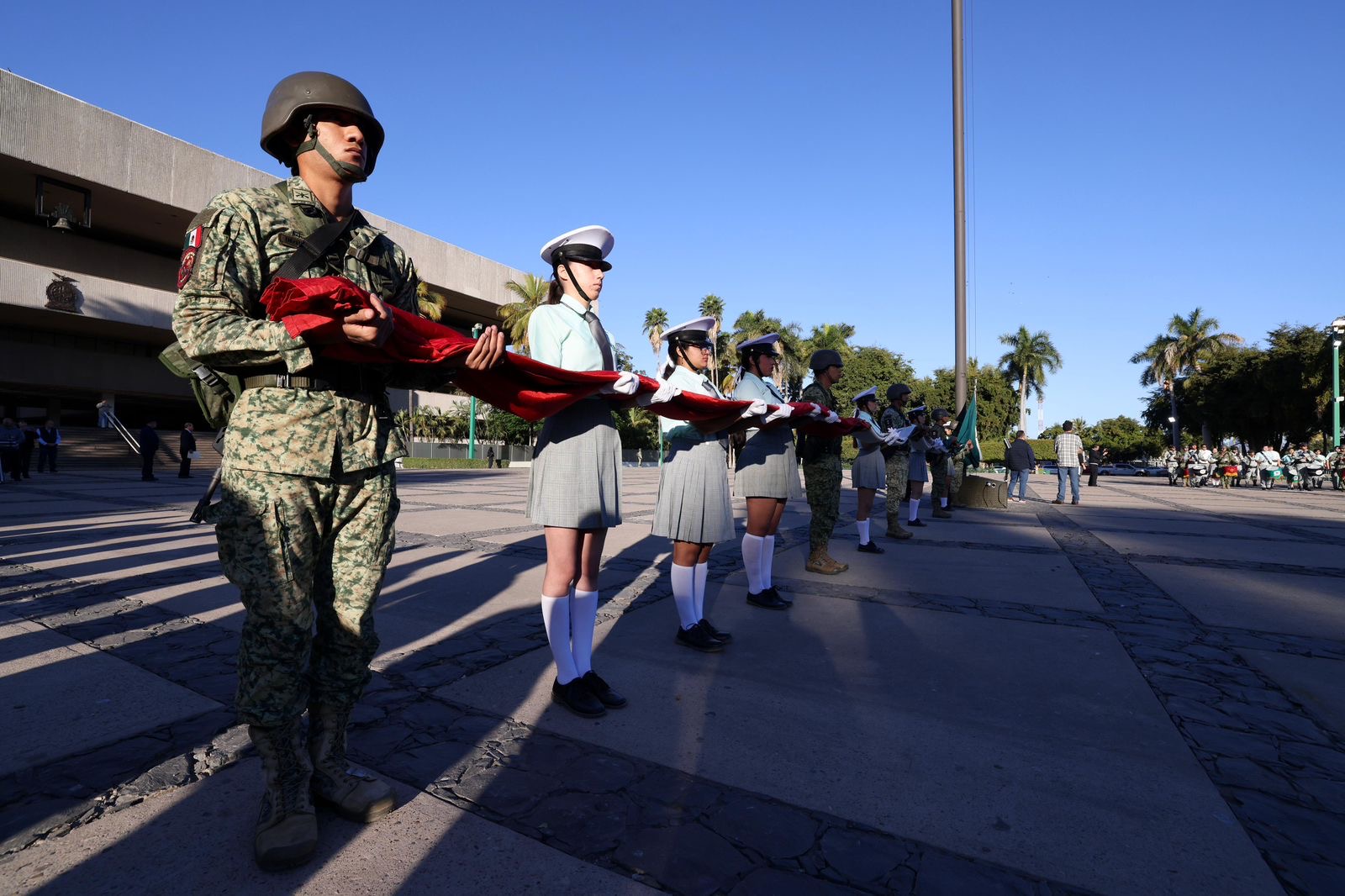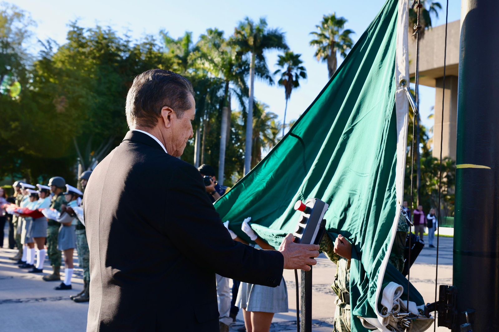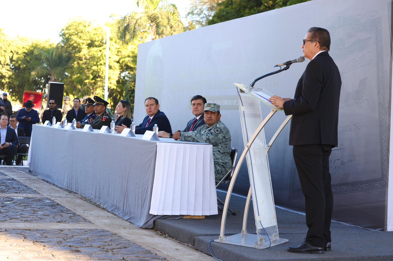 El funcionario estatal estuvo acompañado de Yeraldine Bonilla Valverde Presidenta de la Mesa Directiva del Congreso del Estado, Jesús Iván Chávez Rangel Presidente del Supremo Tribunal de Justicia, José Ernesto Peñuelas Secretario del Ayuntamiento, Teniente Adán Landeros Espinoza en representación de la Novena Zona Militar, Inspector Uriel Sánchez Hernández representante de la Guardia Nacional en Sinaloa y Luis Enrique Flores Morales Capitán 2do. Fuerza Aérea Aerologista, así como, invitados especiales, jefes, oficiales y tropas castrenses.