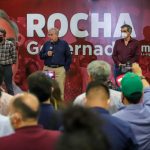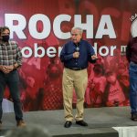 Rubén Rocha Moya estuvo acompañado en la conferencia del triunfo por sus hijos: Eneyda, Rubén, Ricardo y José Jesús; así como por la senadora Imelda Castro Castro y la secretaria nacional de Mujeres de Morena, Carol Arriaga.